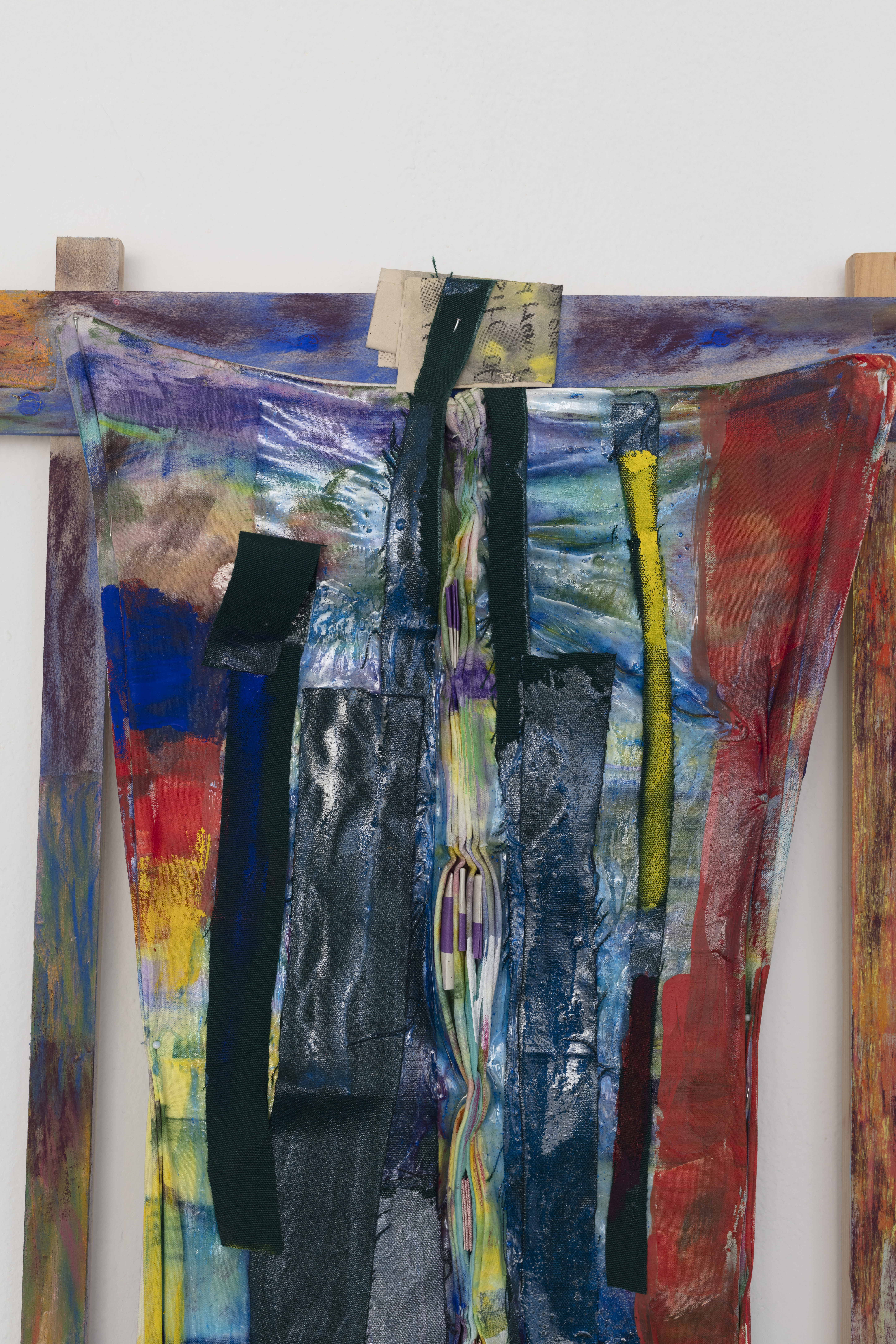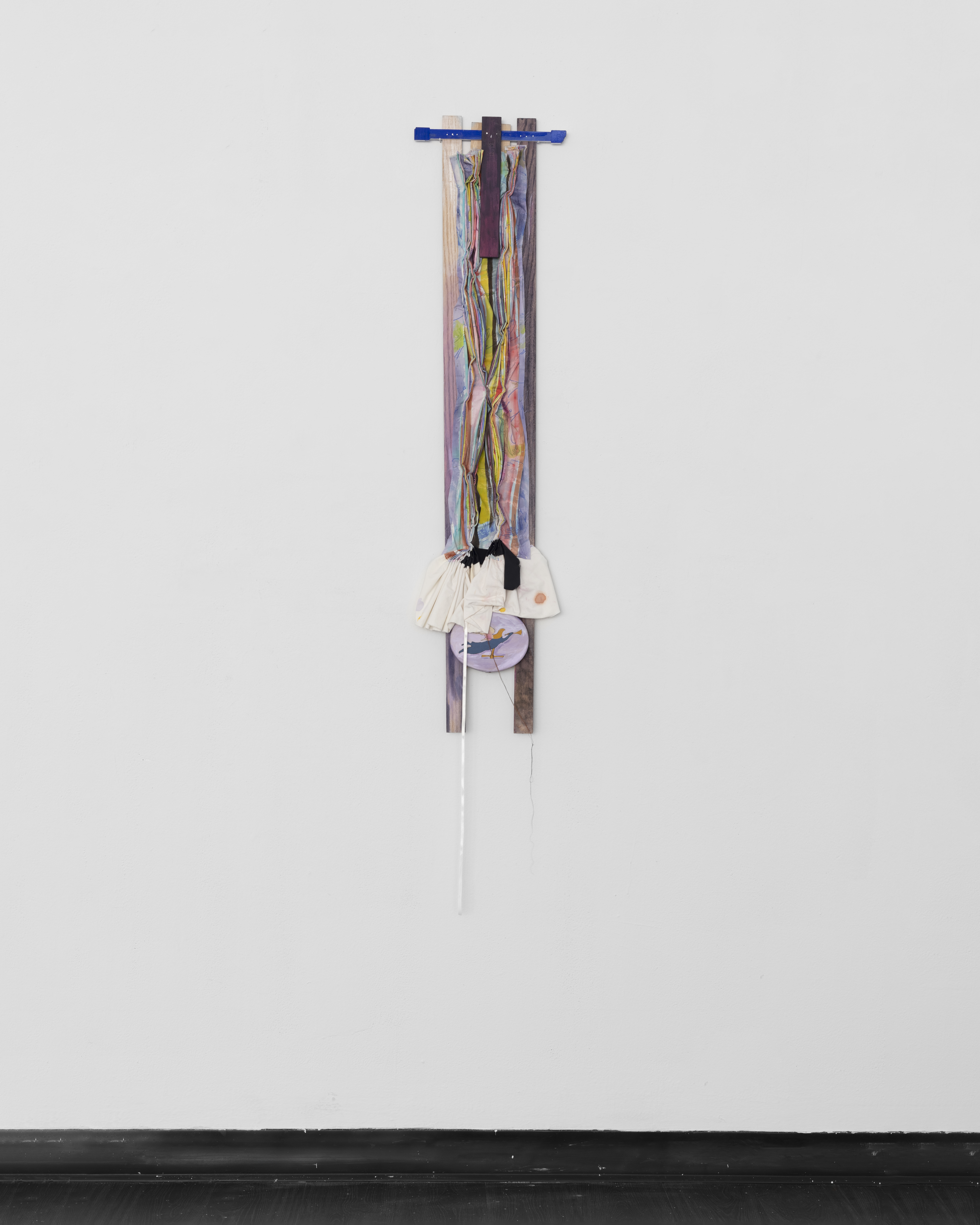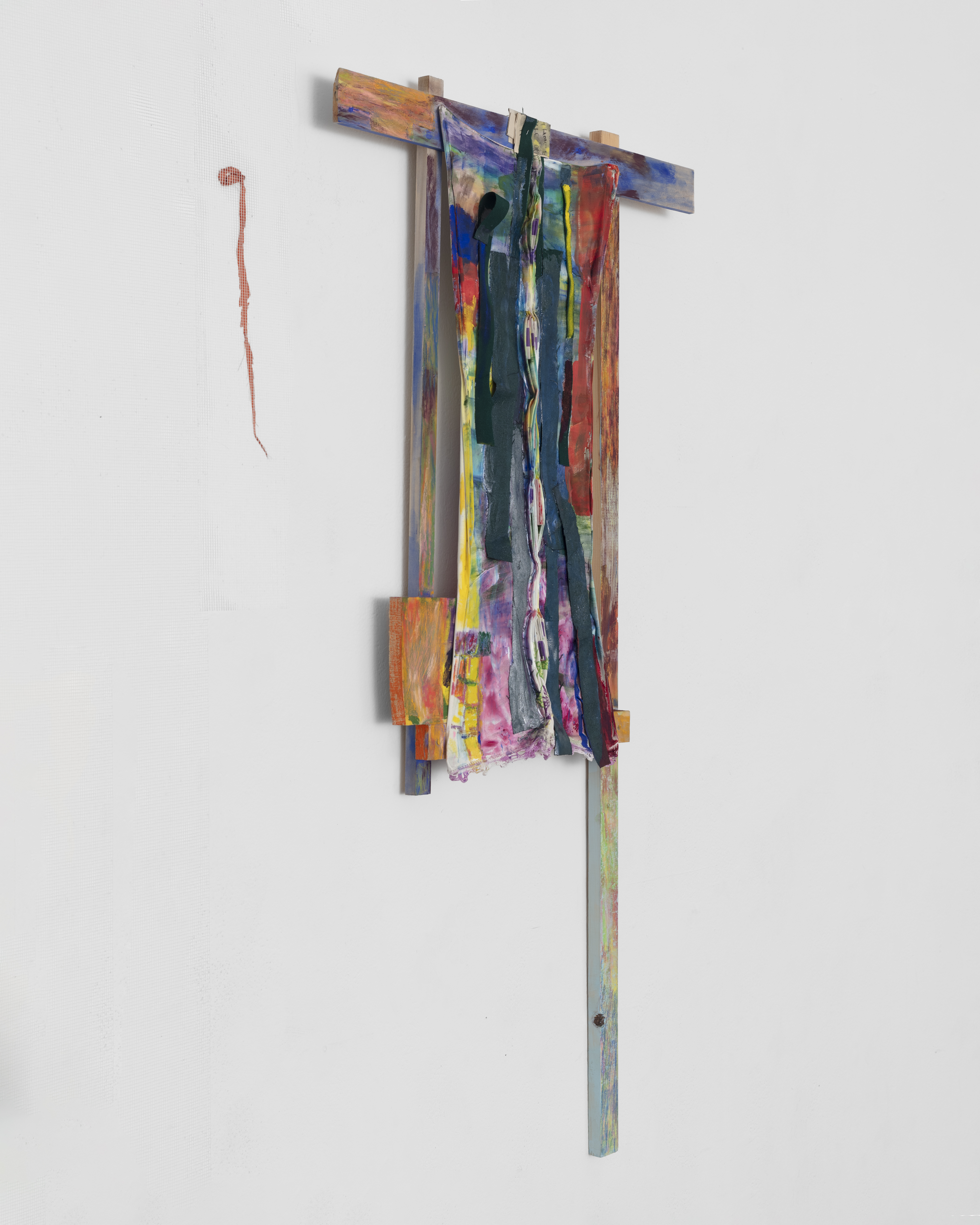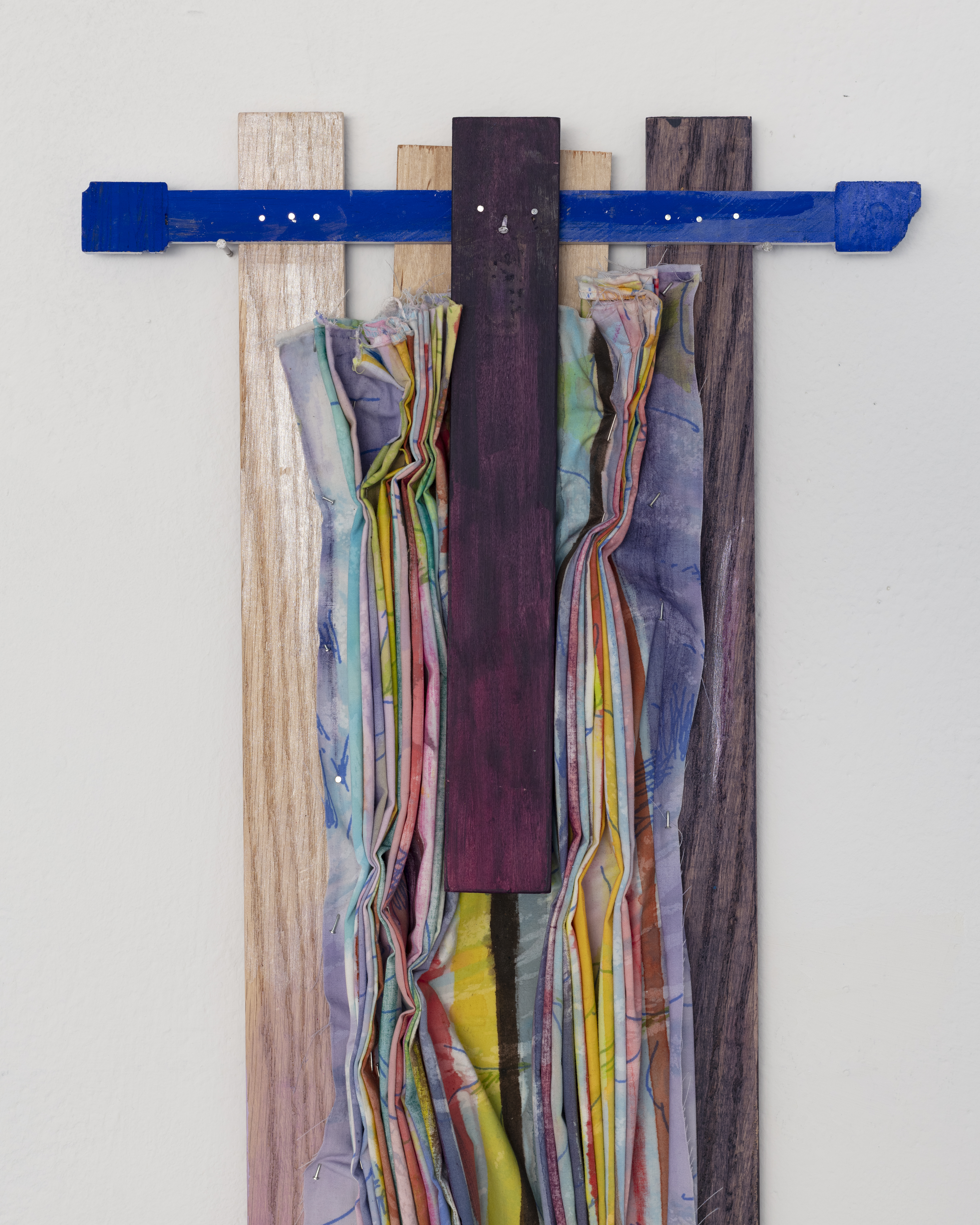 The Drop Evaporates By Law, 70.5” x 12.5”, wood, nails, fabric, steel pins, acrylic, pastel chalk, wax pastel, pine resin, 2025