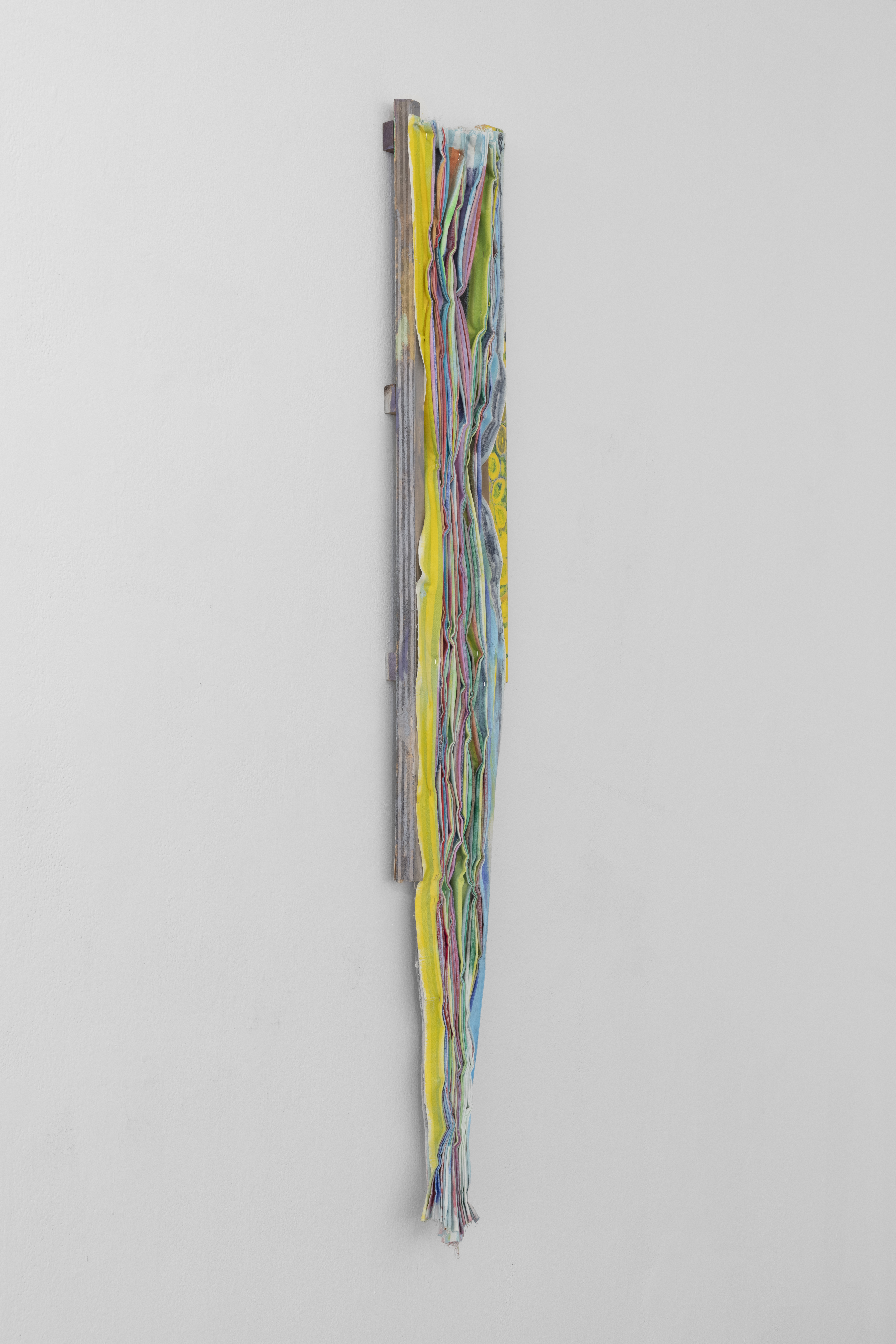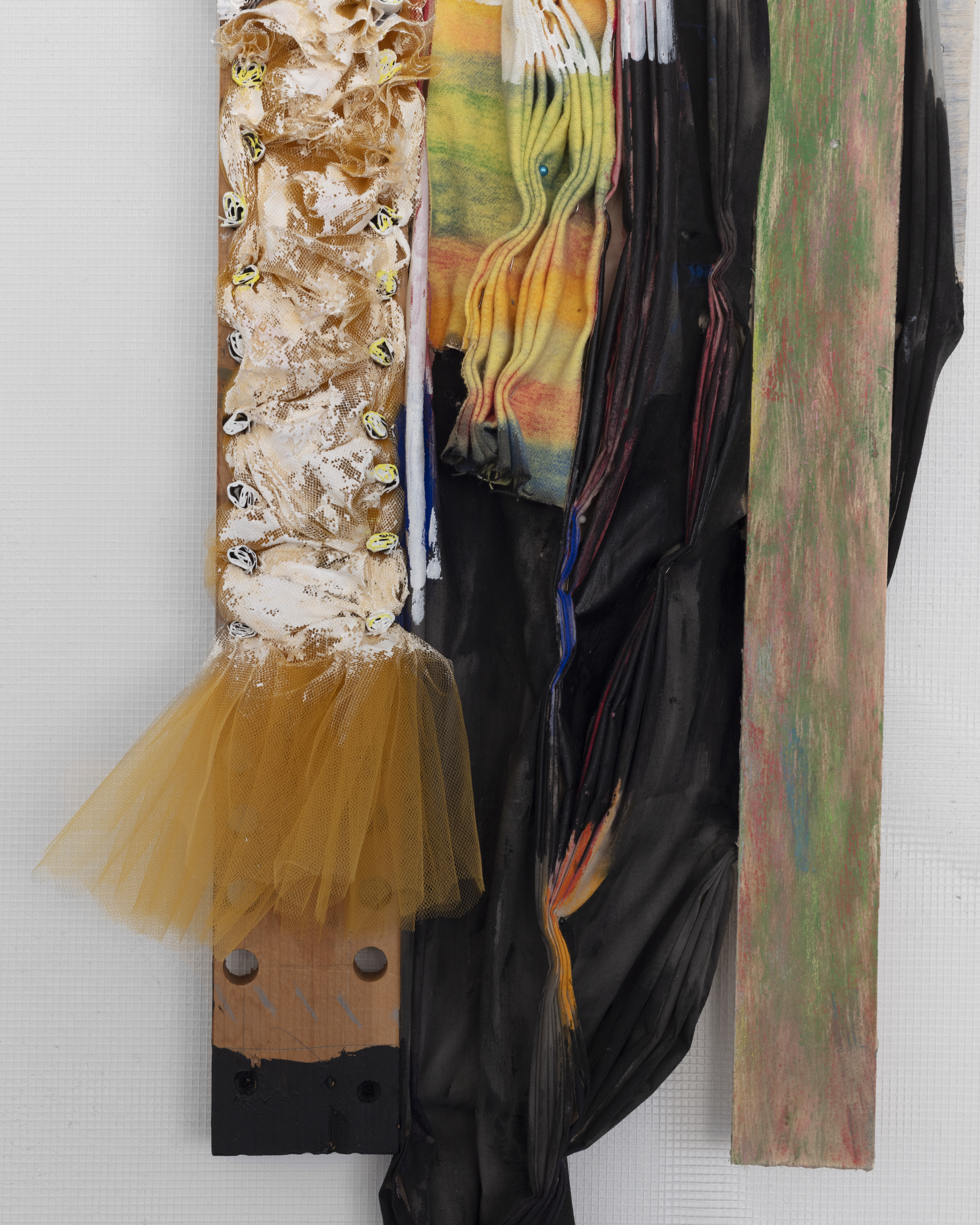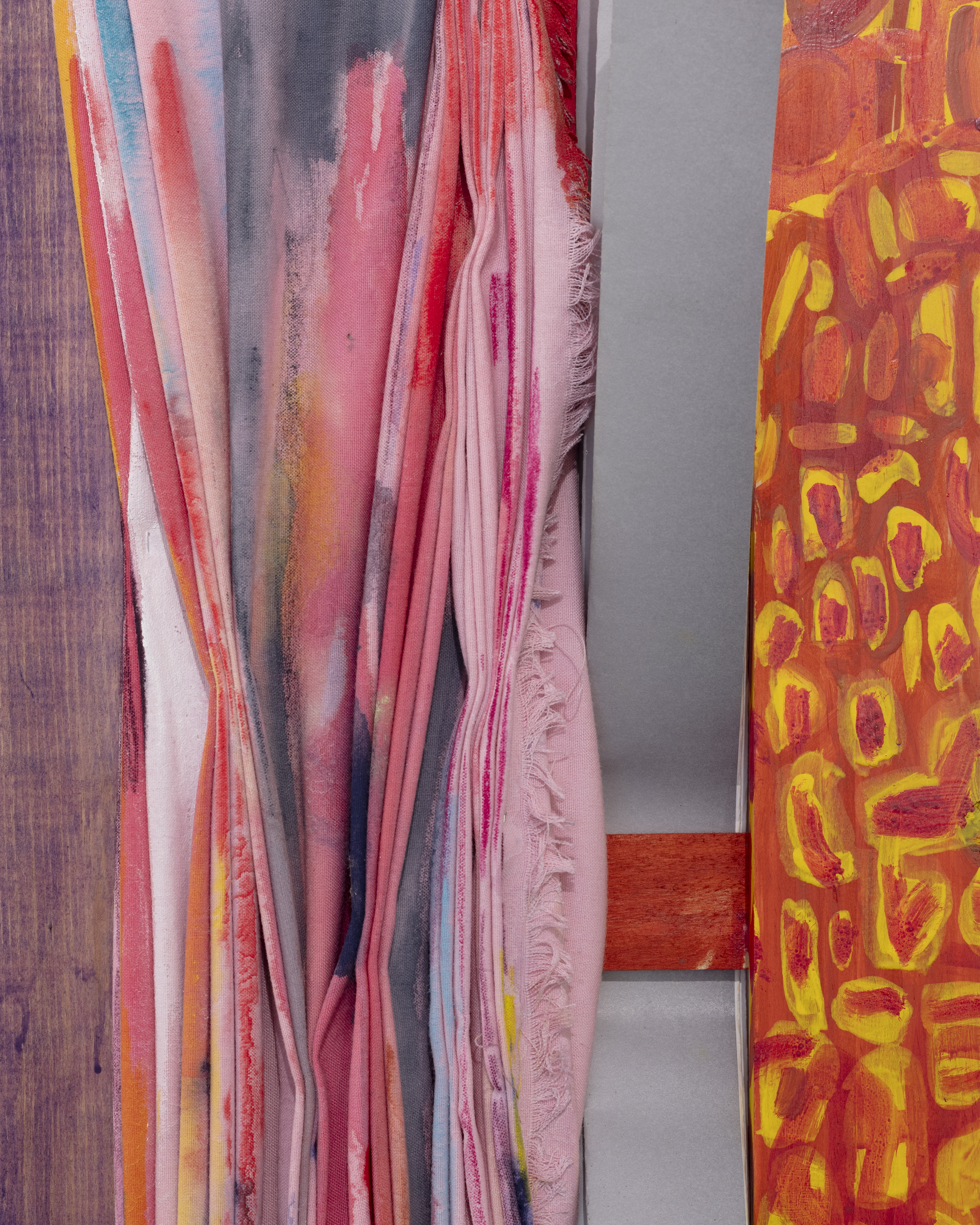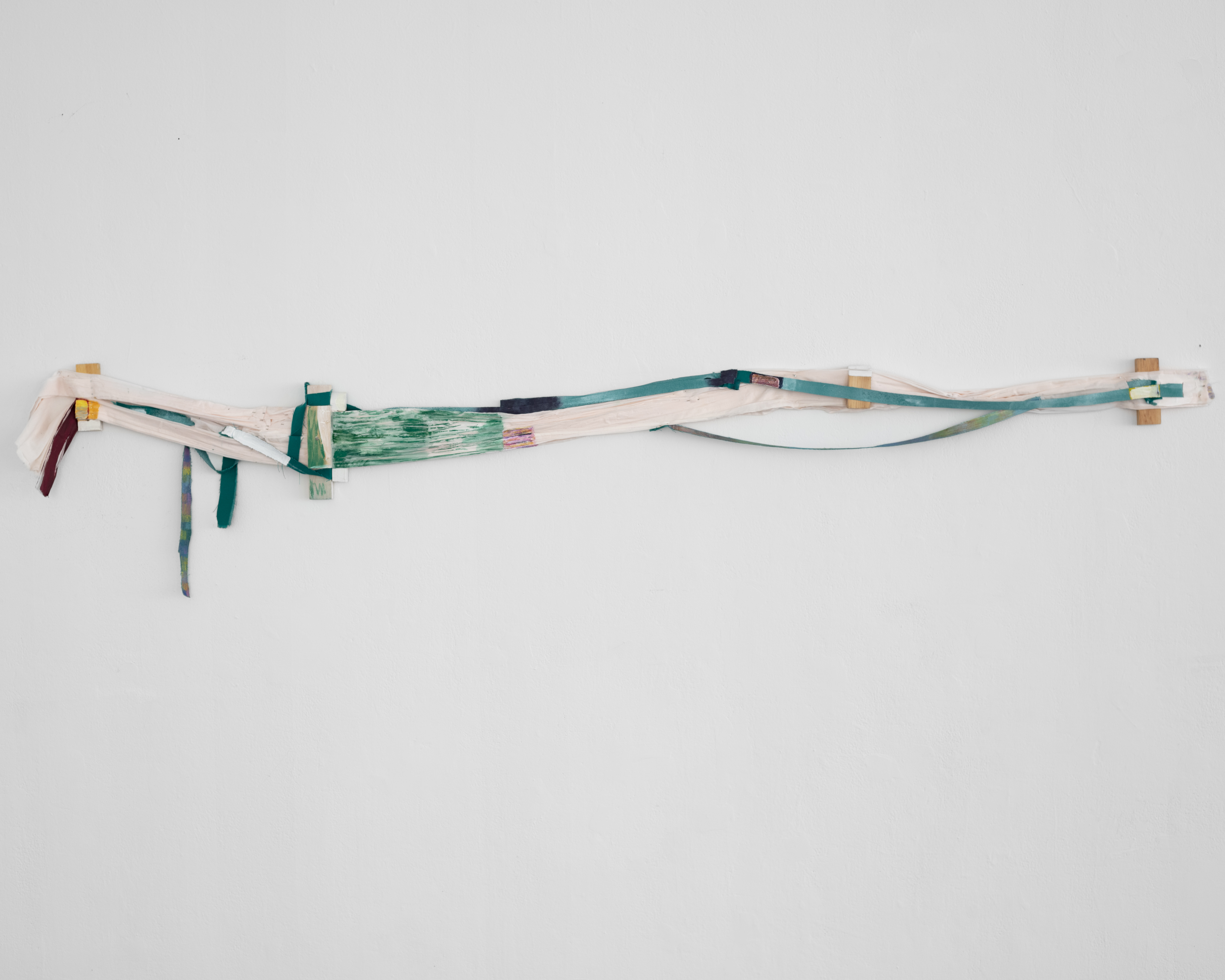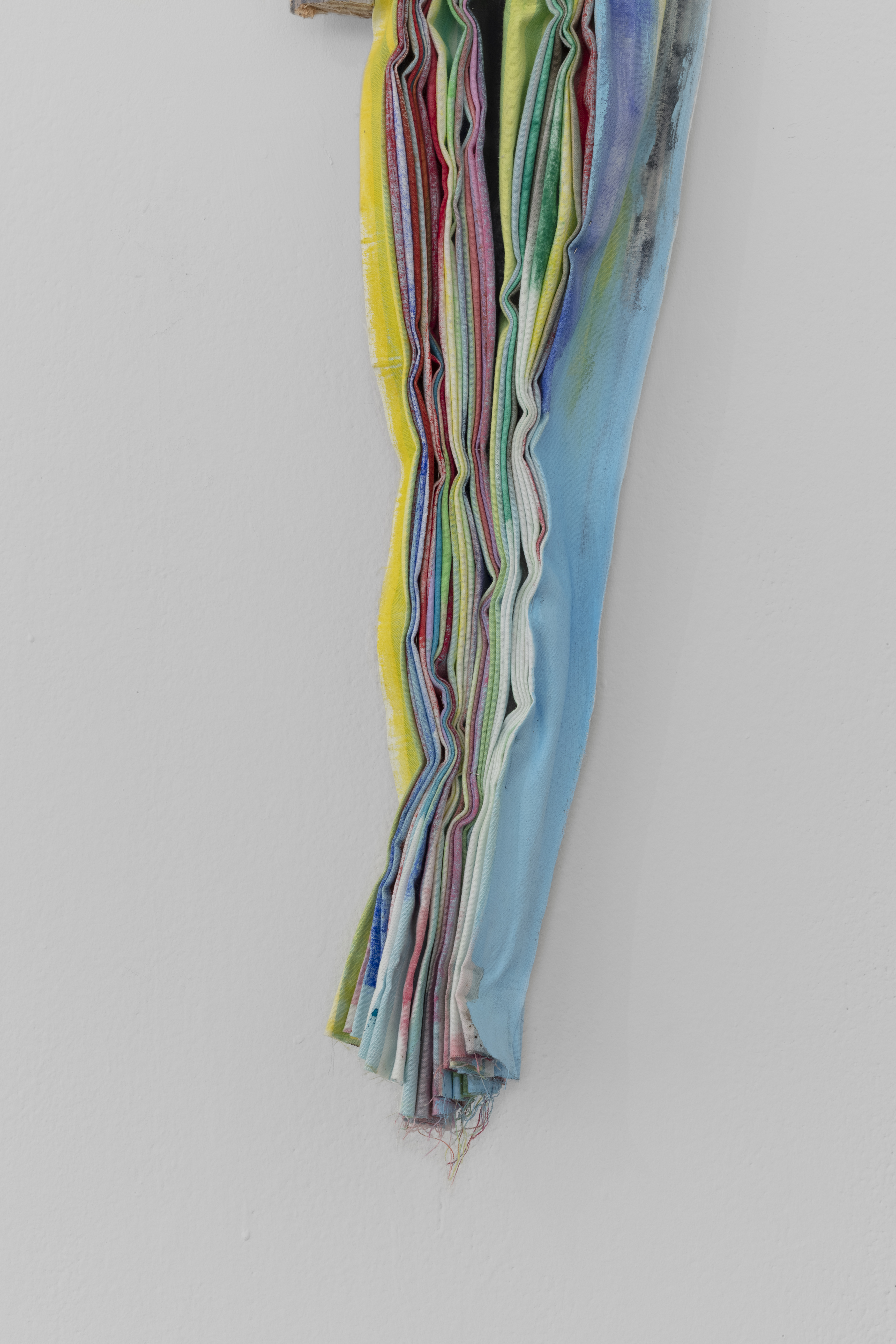 The Drop Evaporates By Law, 70.5” x 12.5”, wood, nails, fabric, steel pins, acrylic, pastel chalk, wax pastel, pine resin, 2025