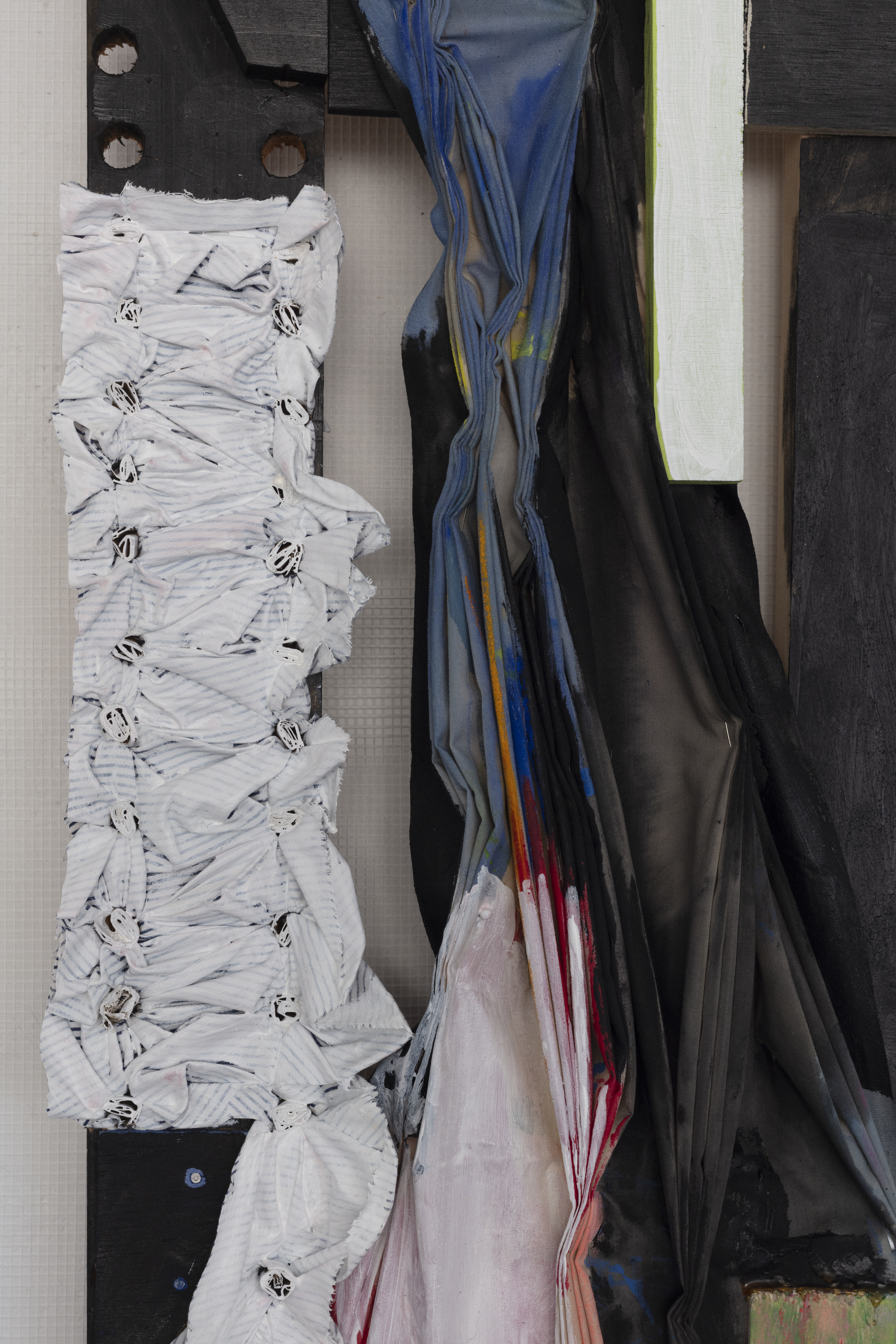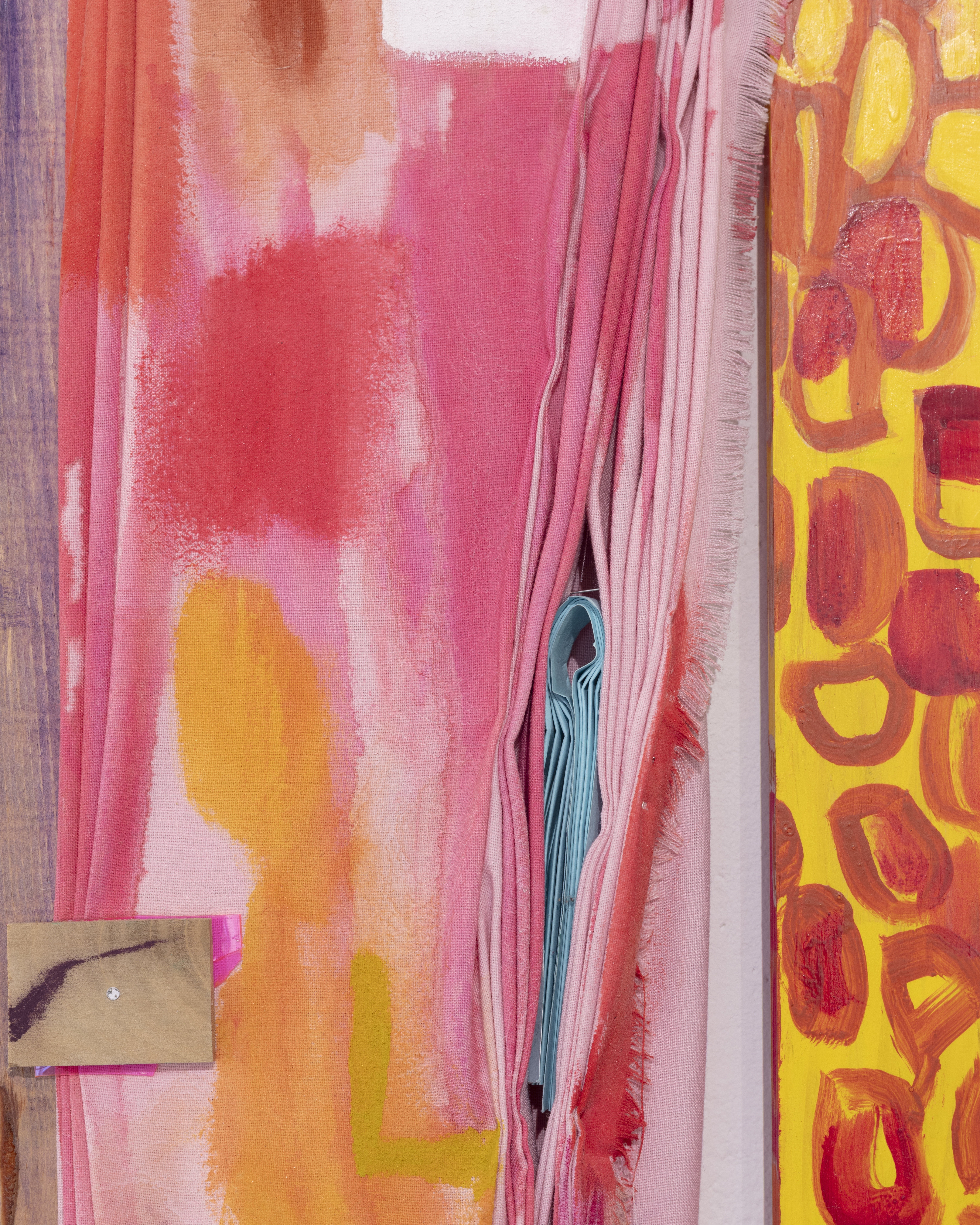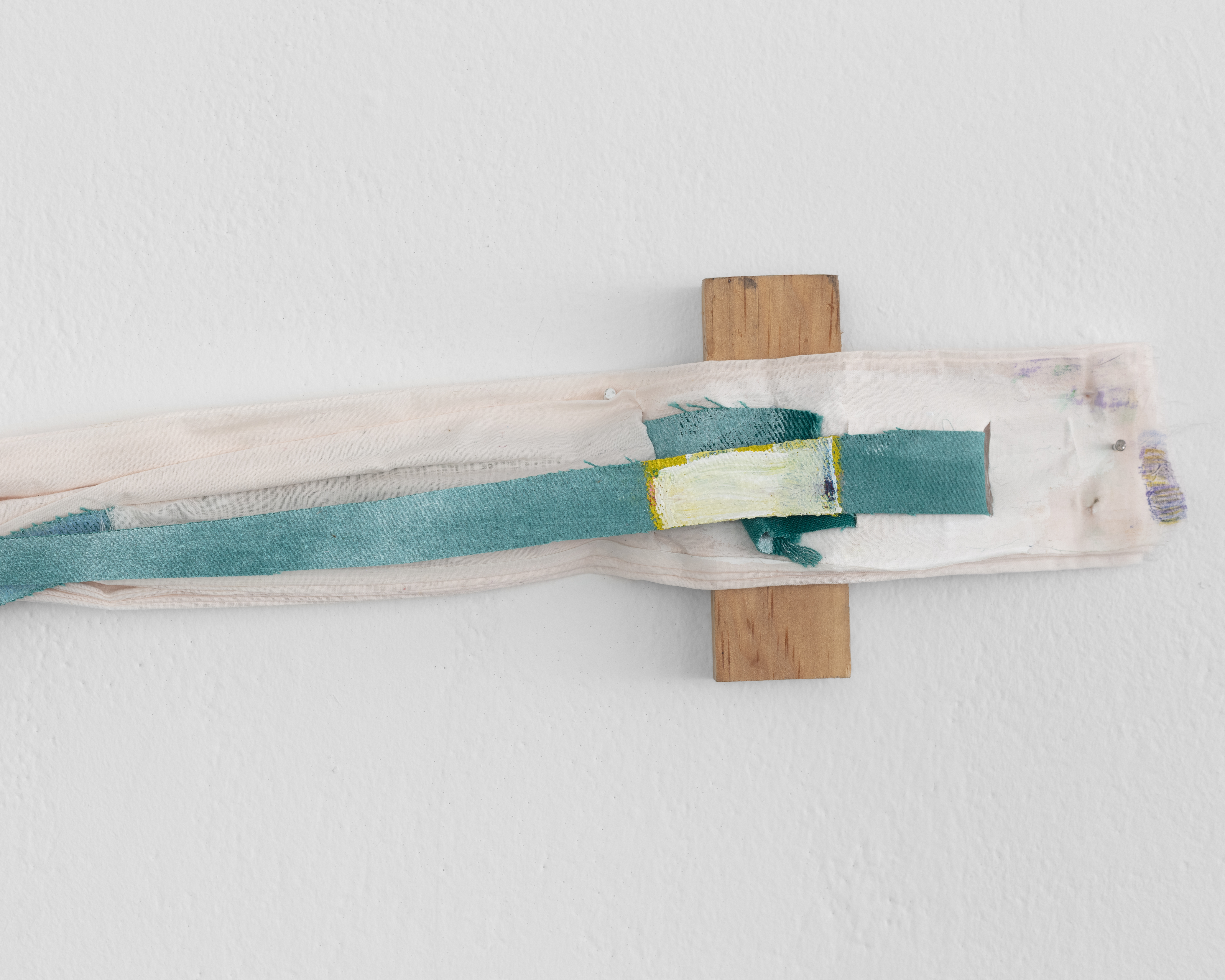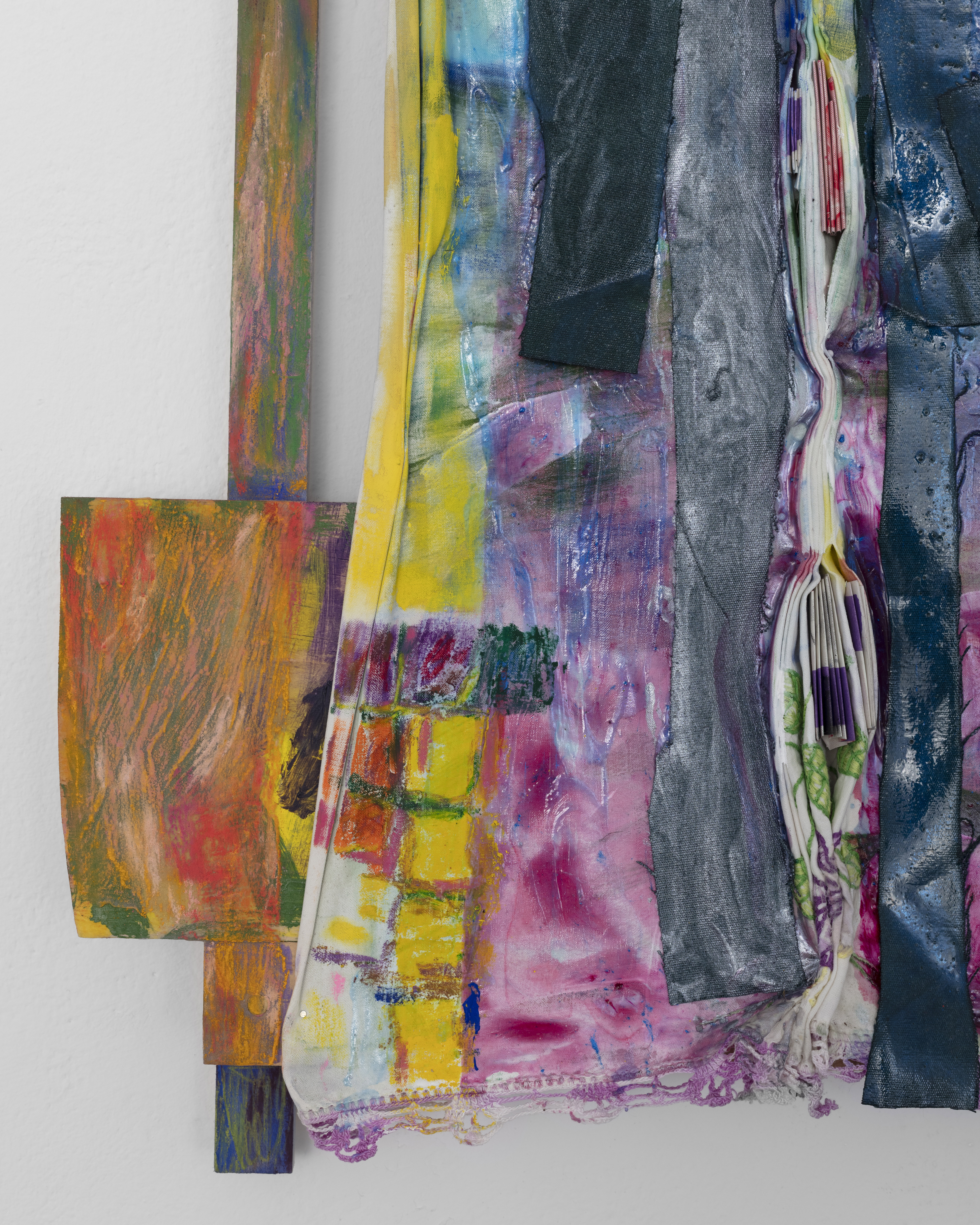 The Drop Evaporates By Law, 70.5” x 12.5”, wood, nails, fabric, steel pins, acrylic, pastel chalk, wax pastel, pine resin, 2025