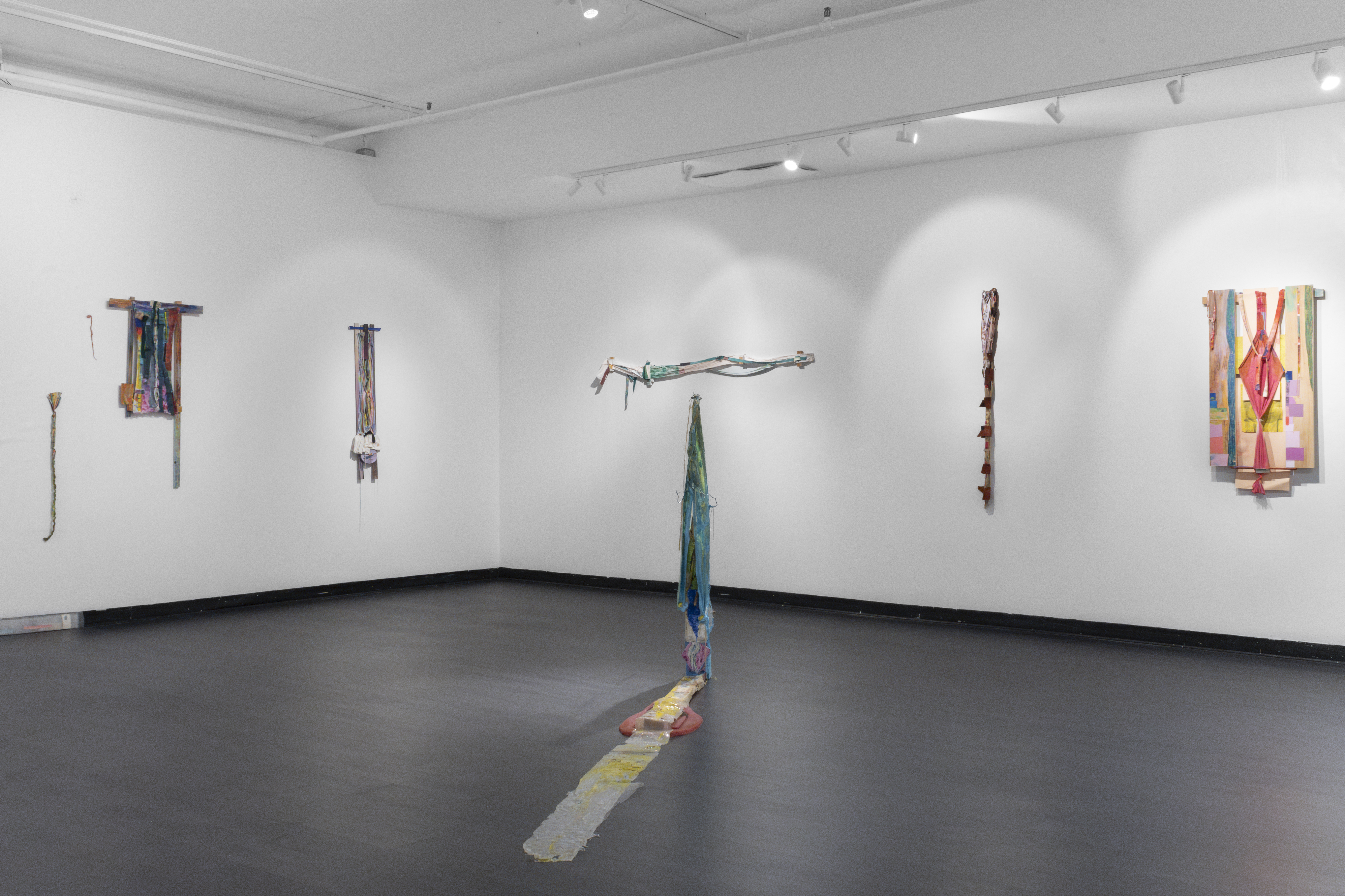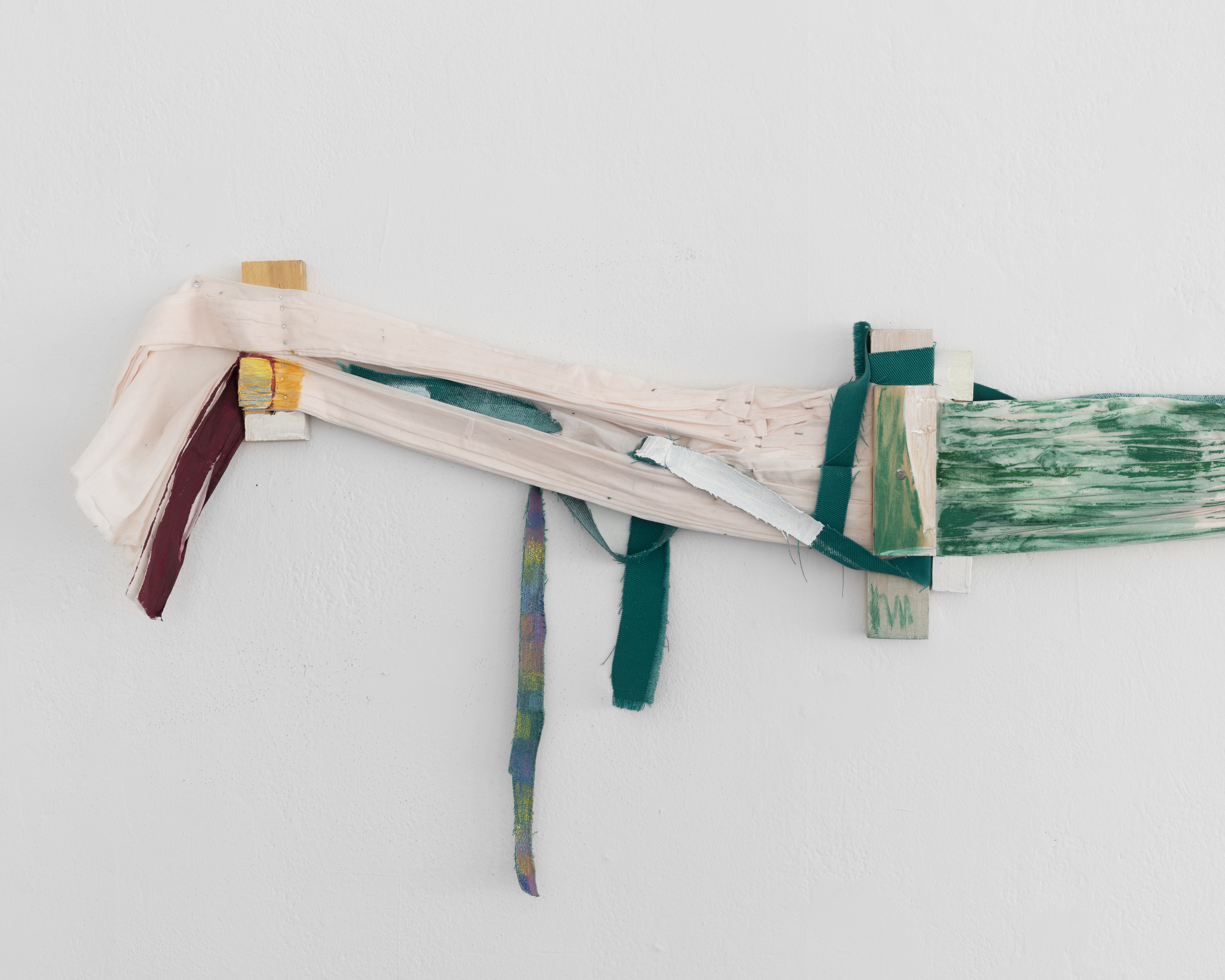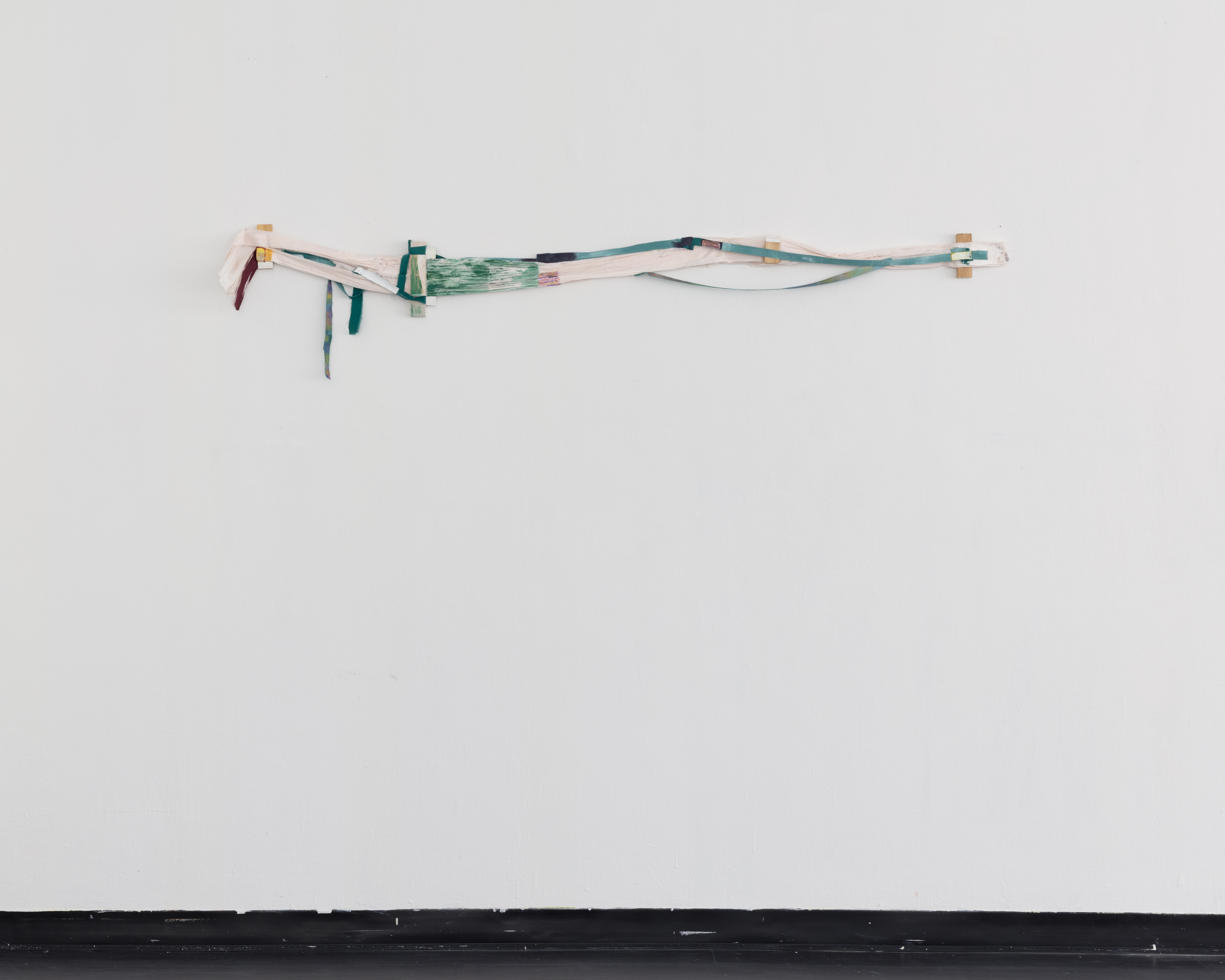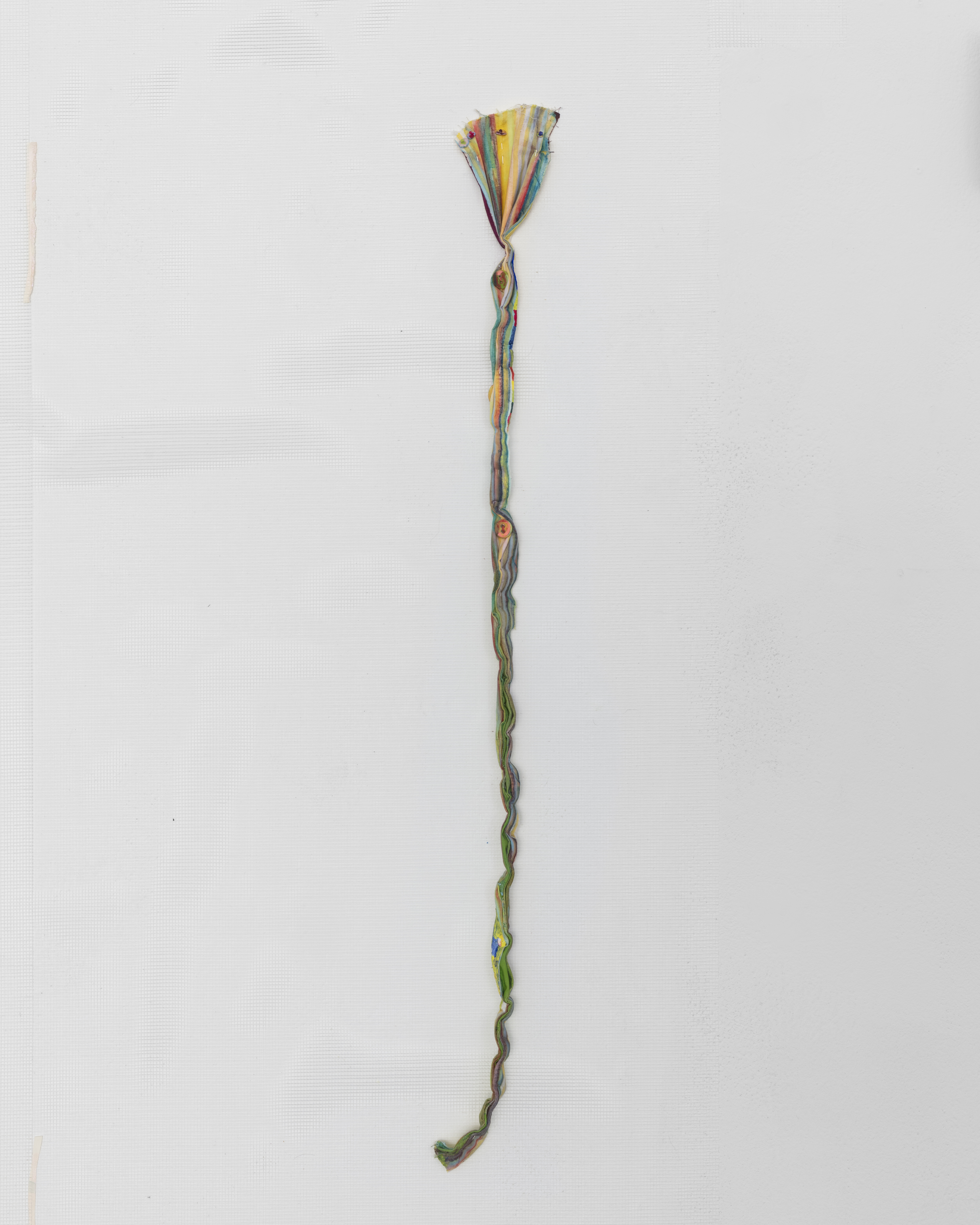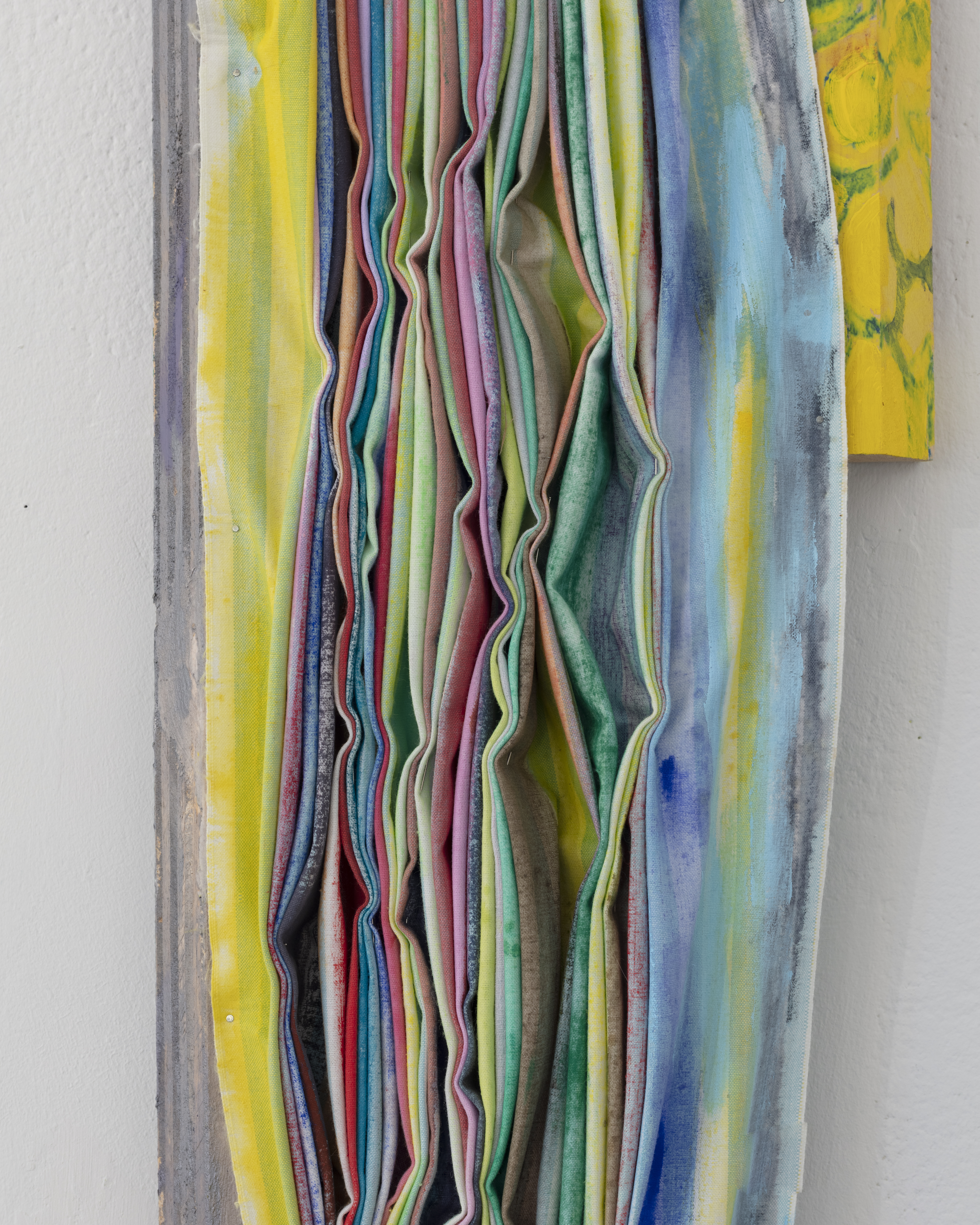 The Drop Evaporates By Law, 70.5” x 12.5”, wood, nails, fabric, steel pins, acrylic, pastel chalk, wax pastel, pine resin, 2025