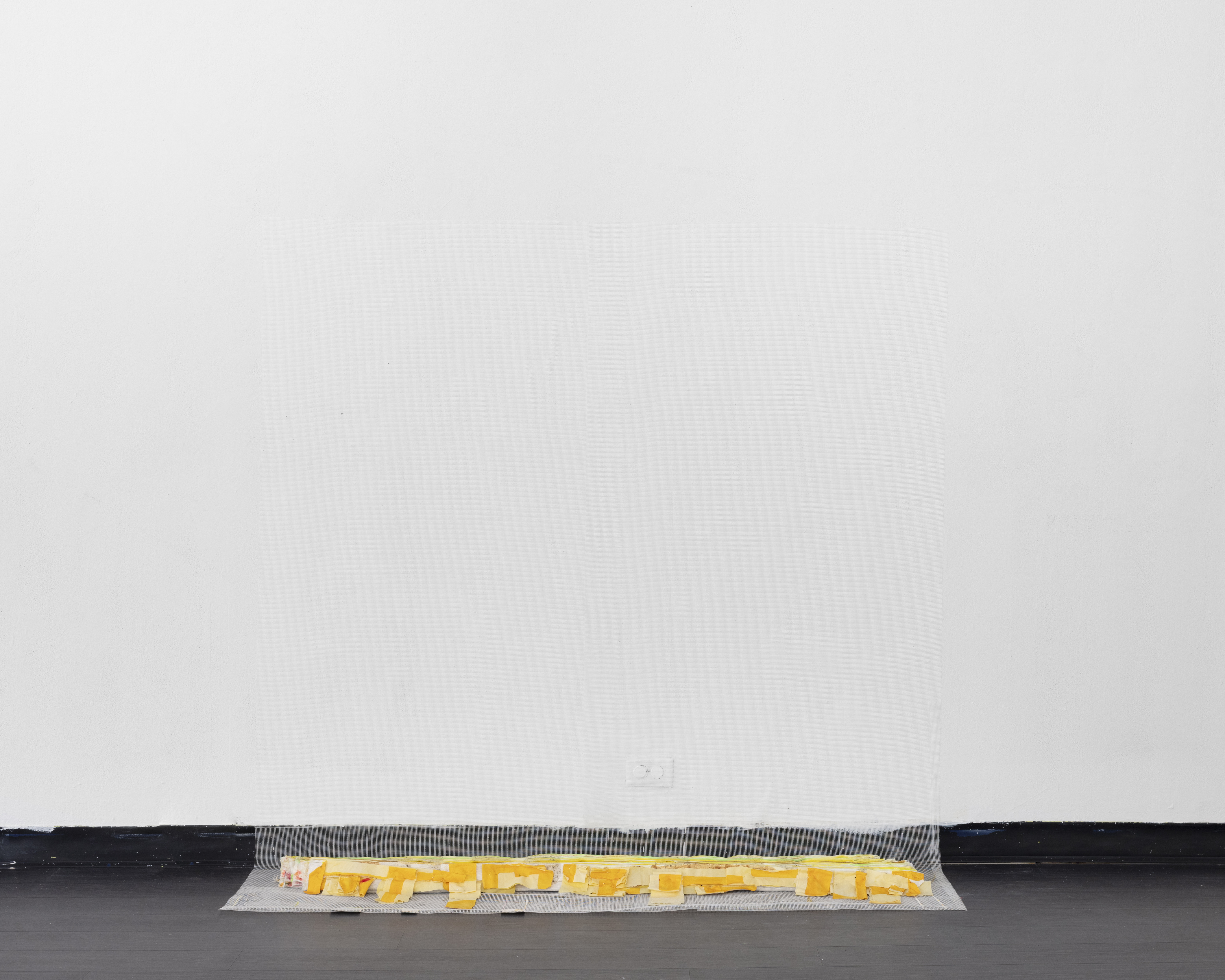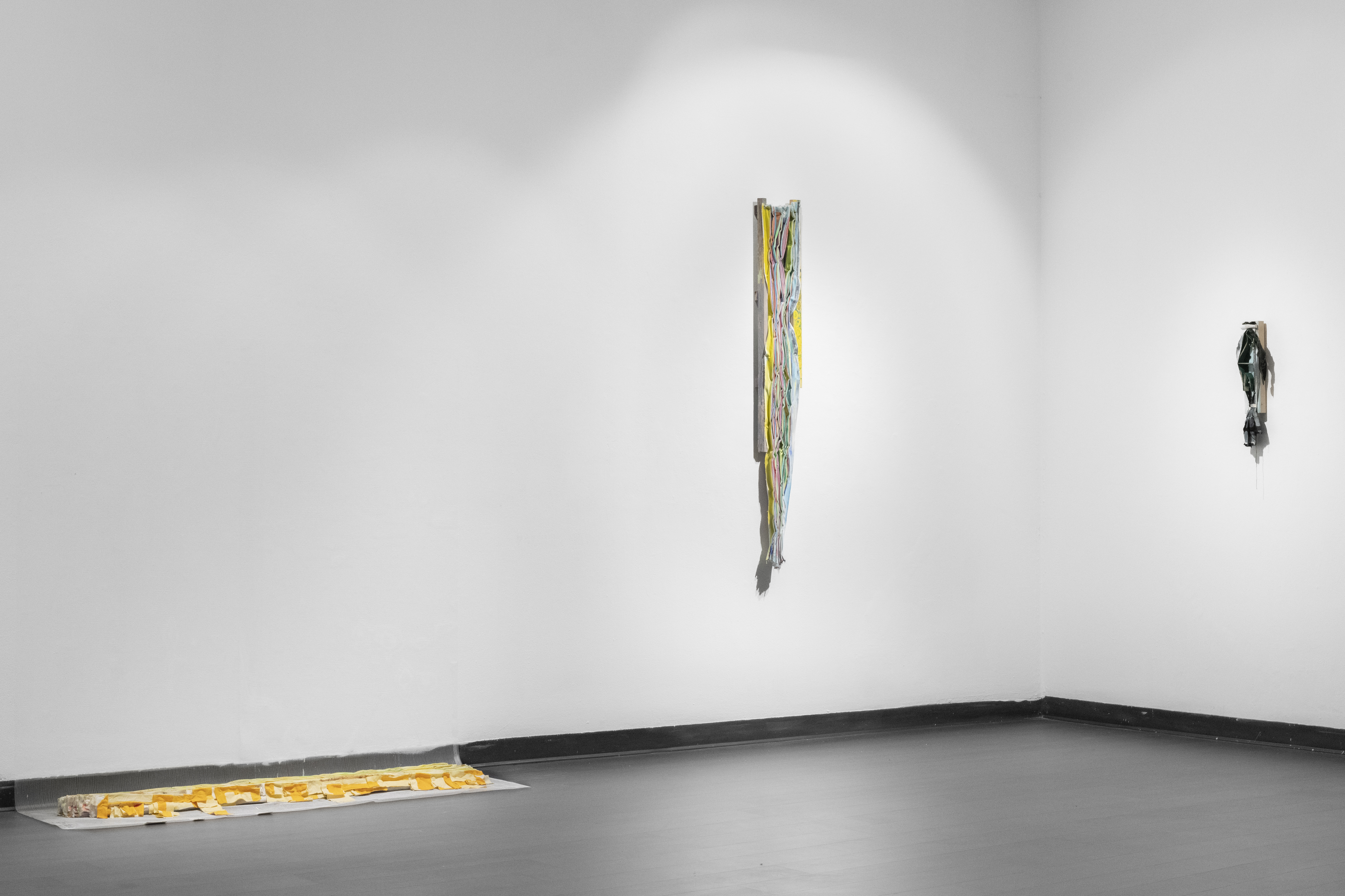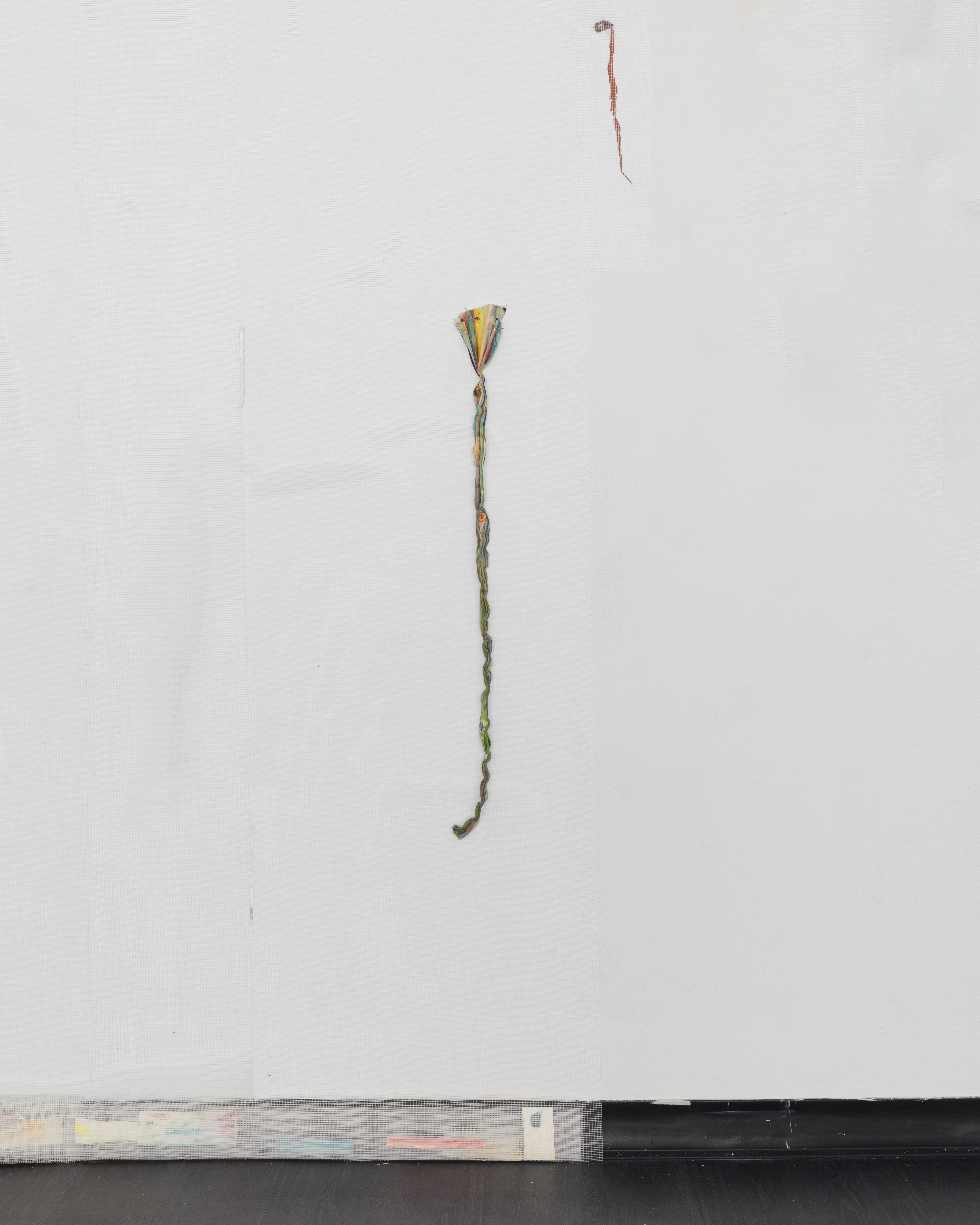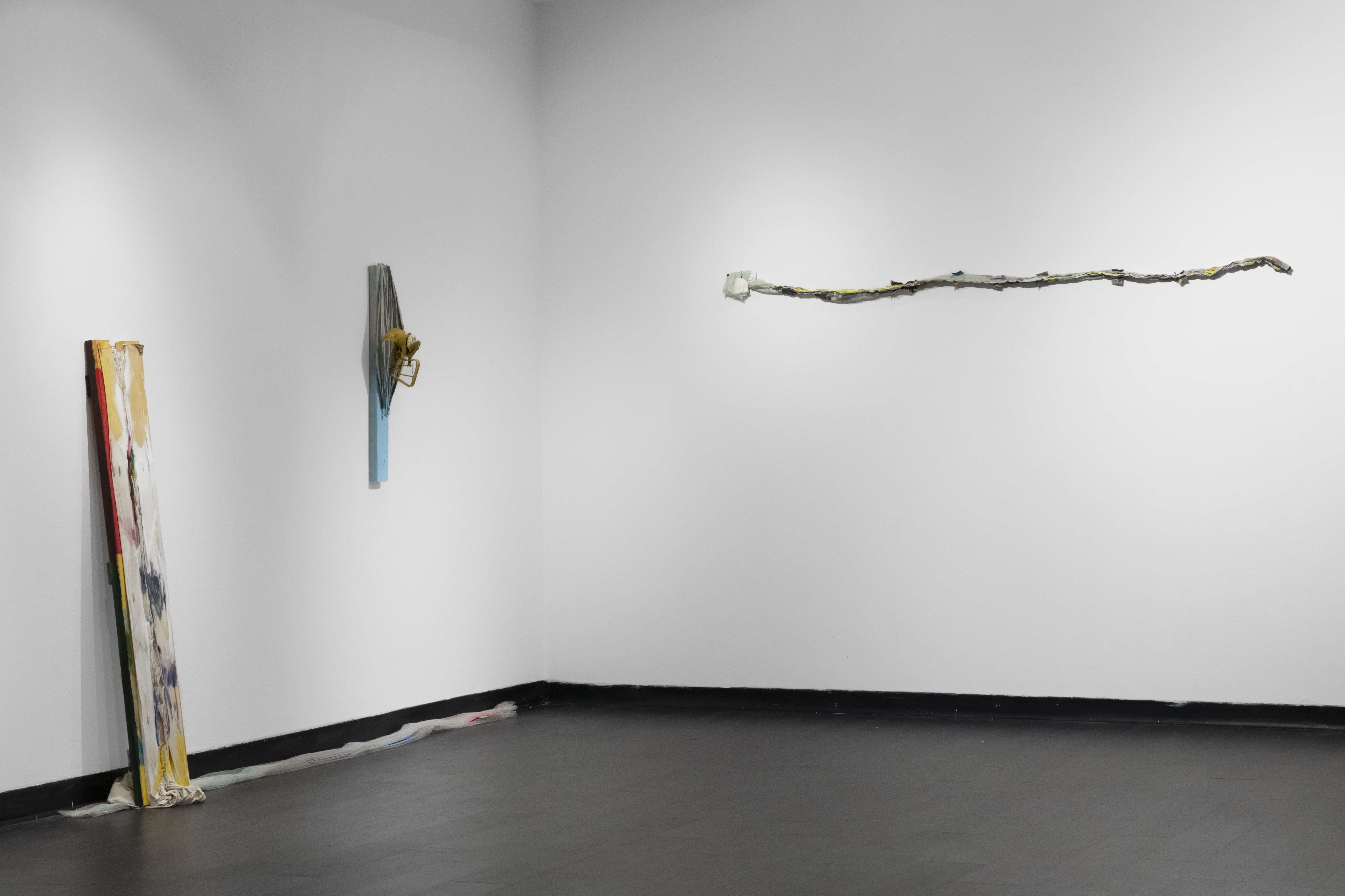 The Drop Evaporates By Law, 70.5” x 12.5”, wood, nails, fabric, steel pins, acrylic, pastel chalk, wax pastel, pine resin, 2025