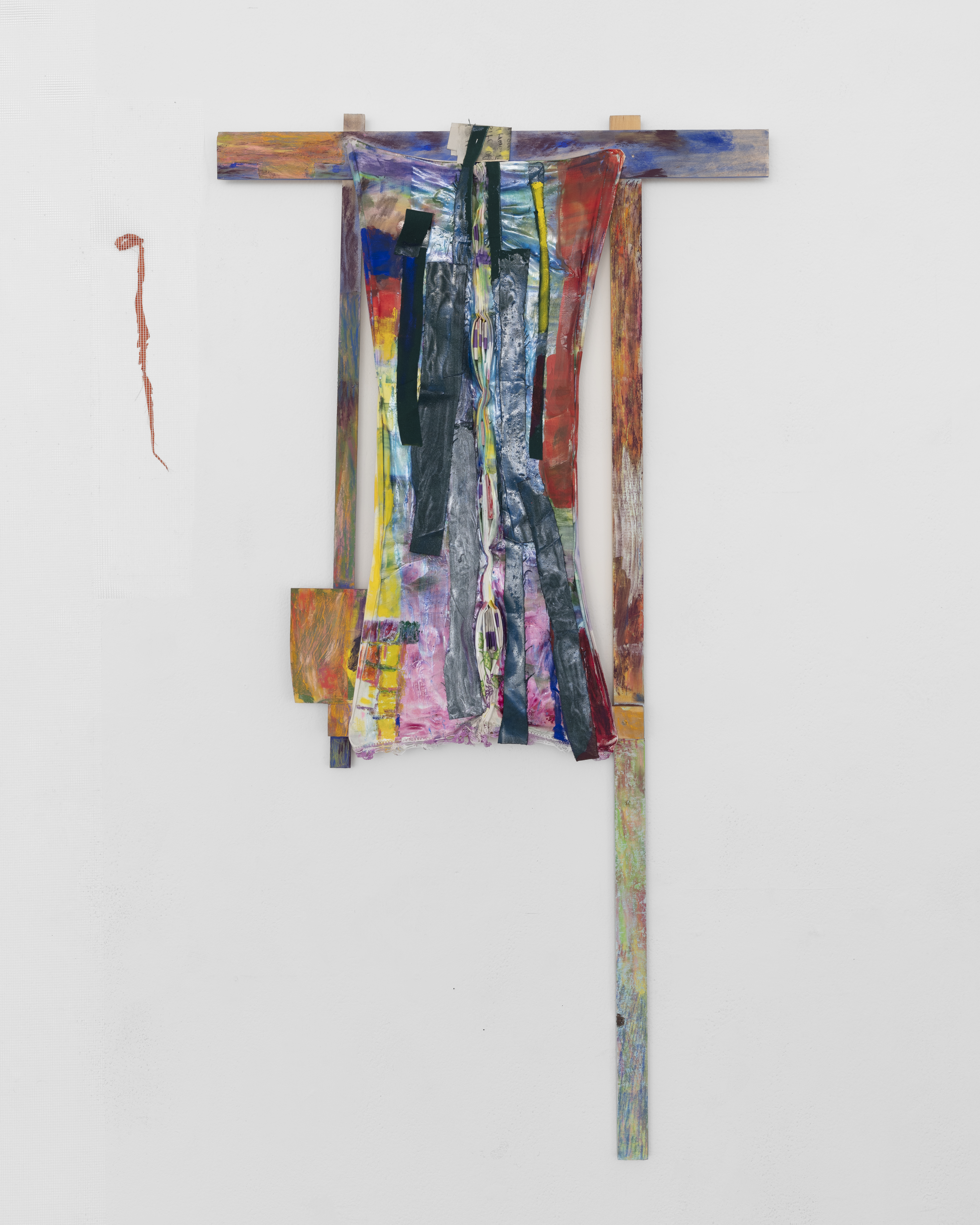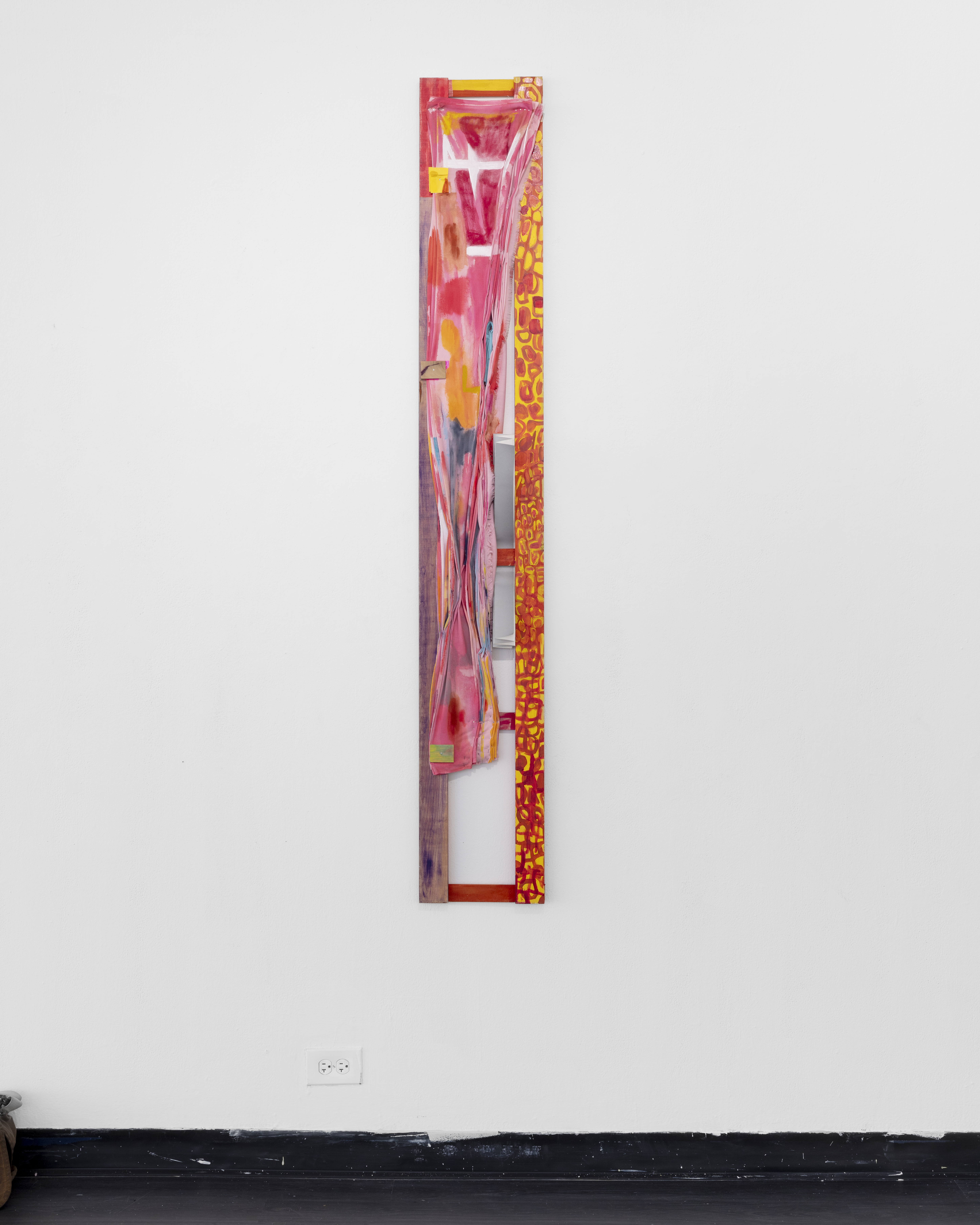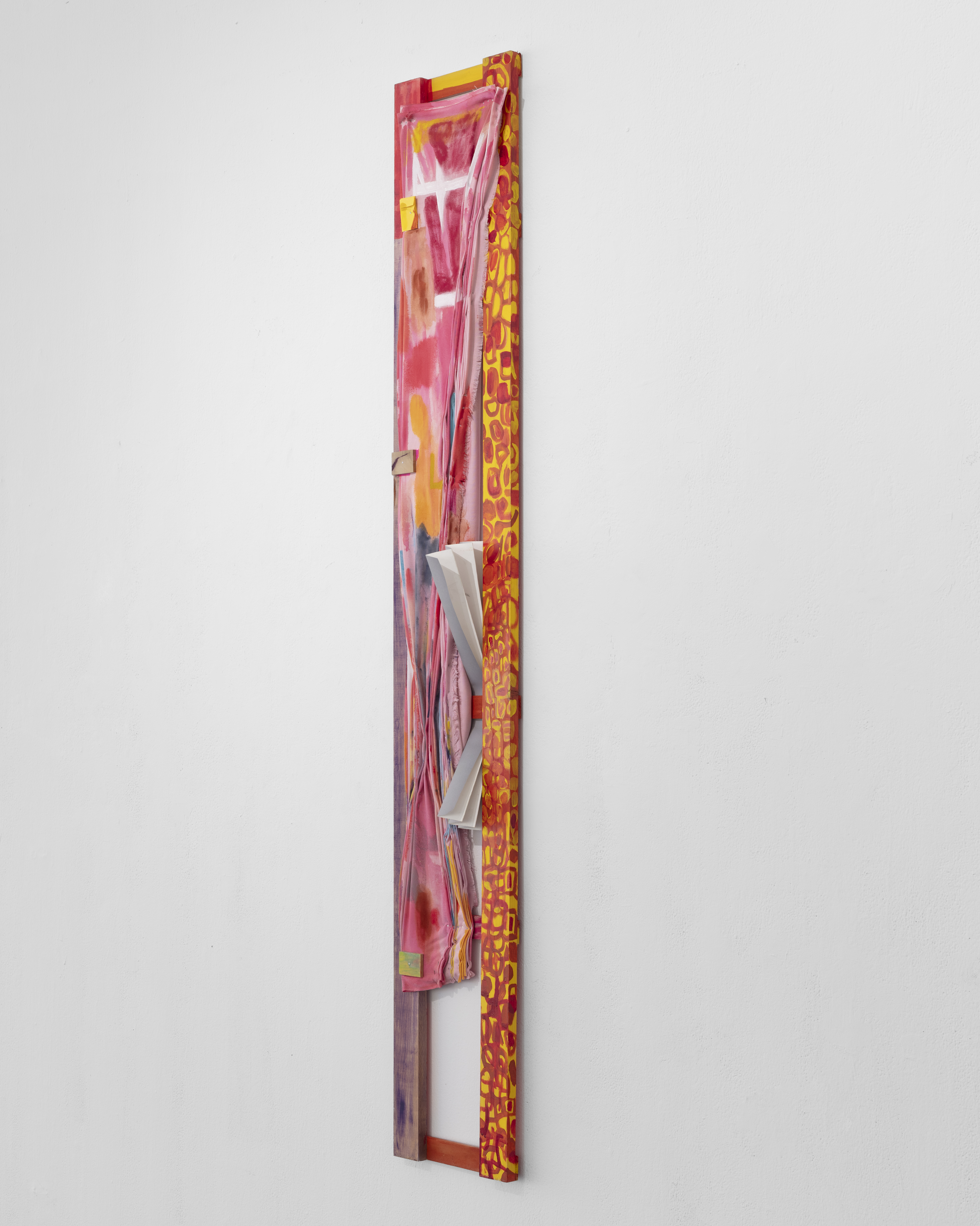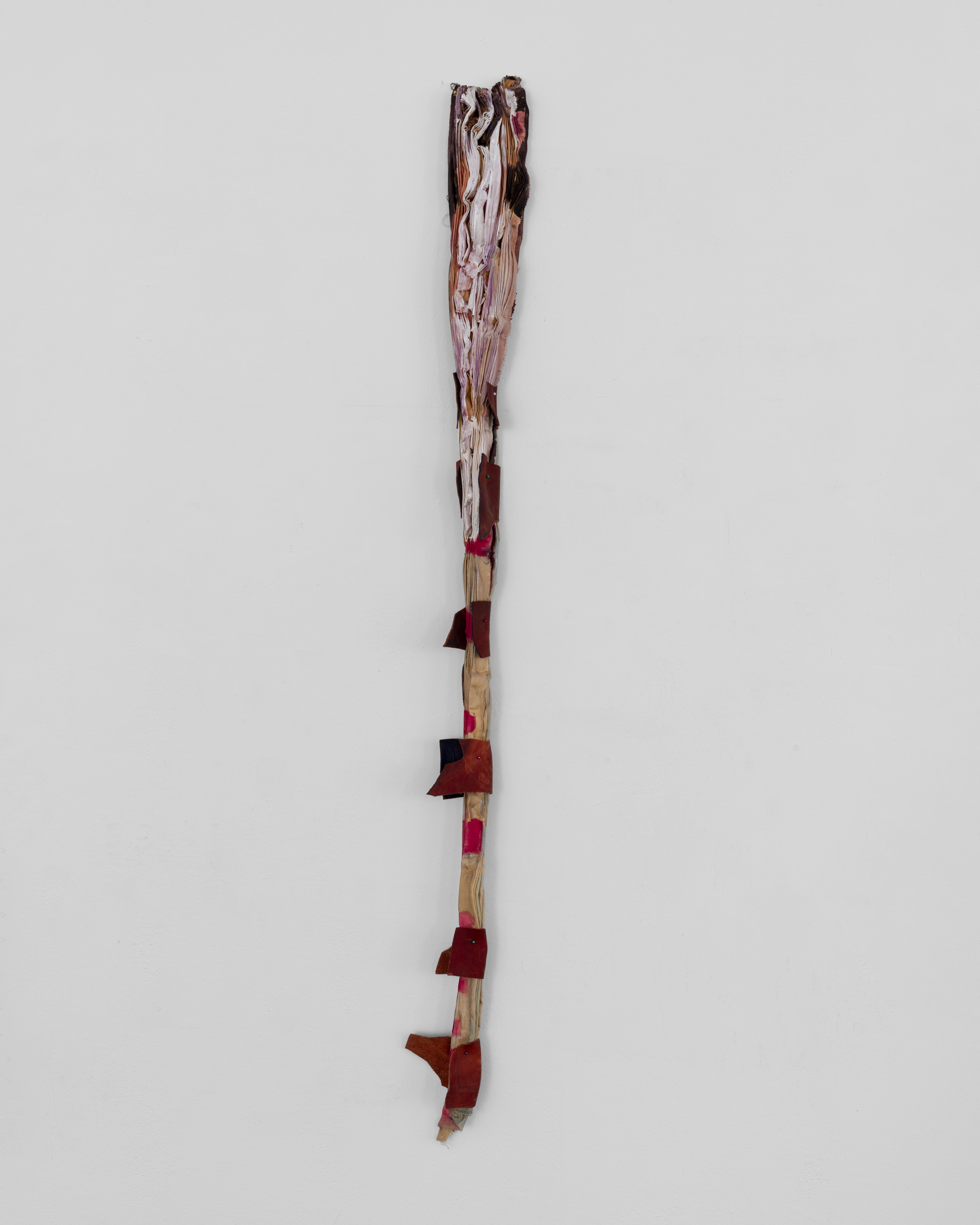 Eyes Closed Glow, 72.5” x 11.5” x 2”, wood acrylic, gouache, wax crayon, steel pins, fabric, nails, paper, 2024