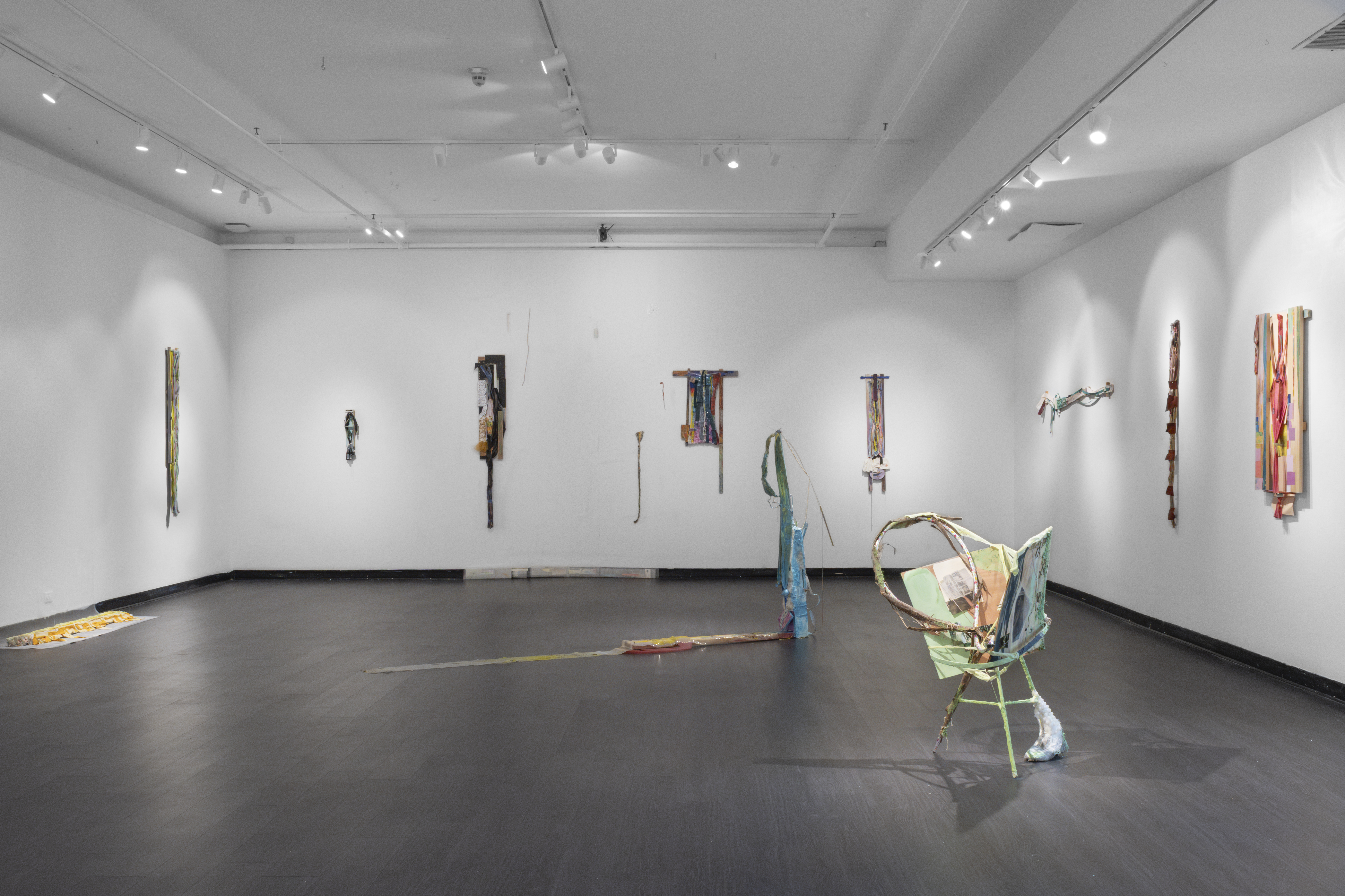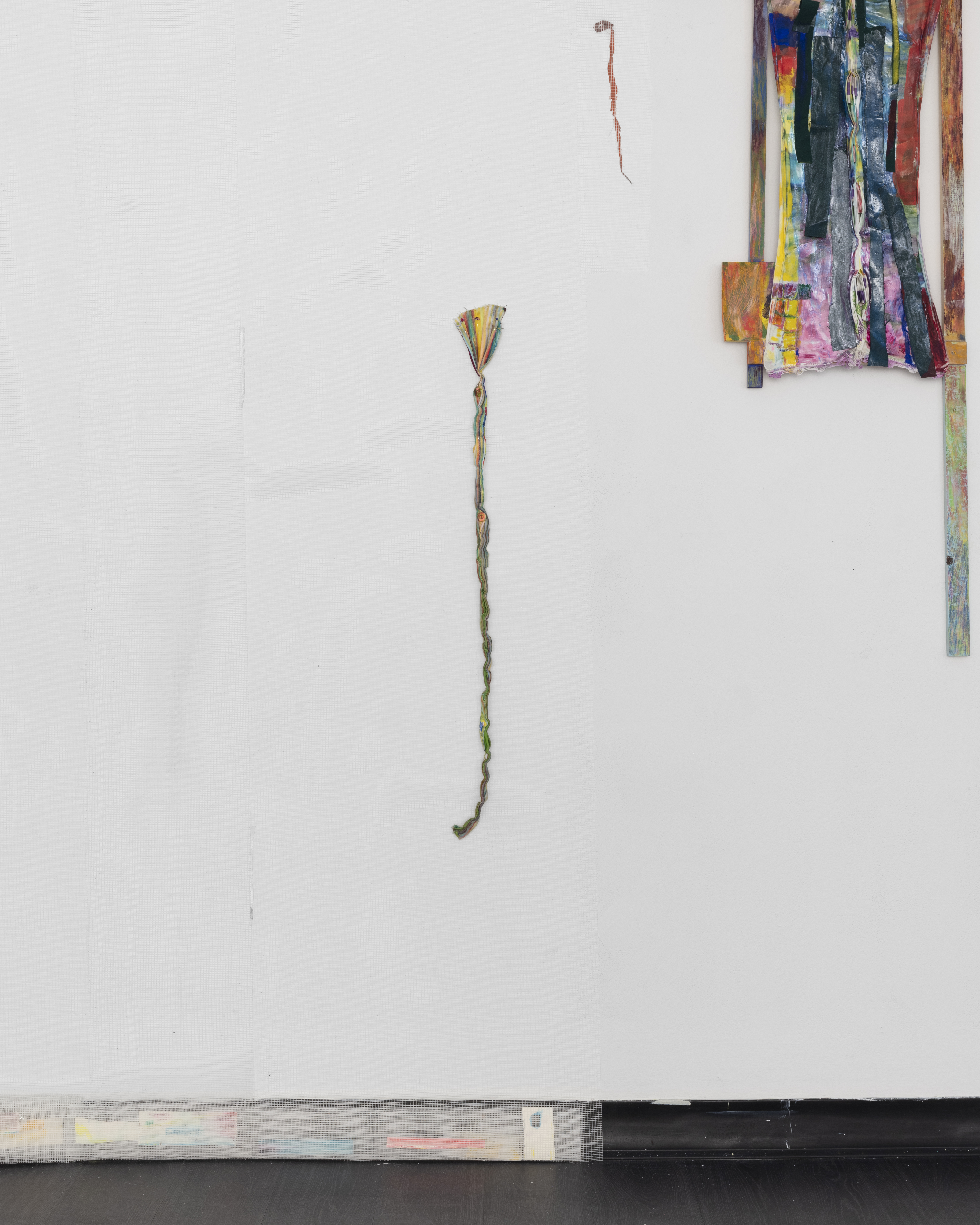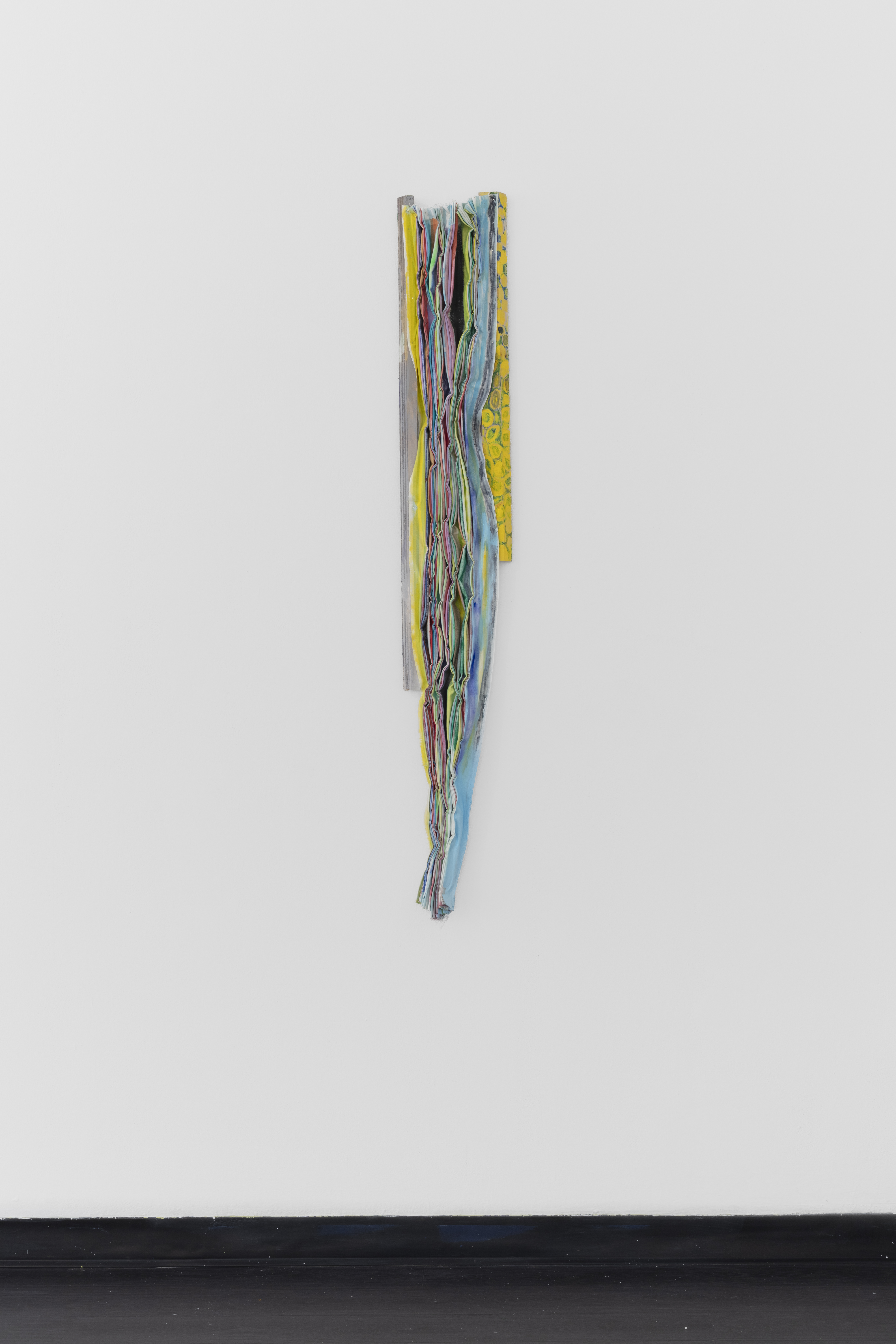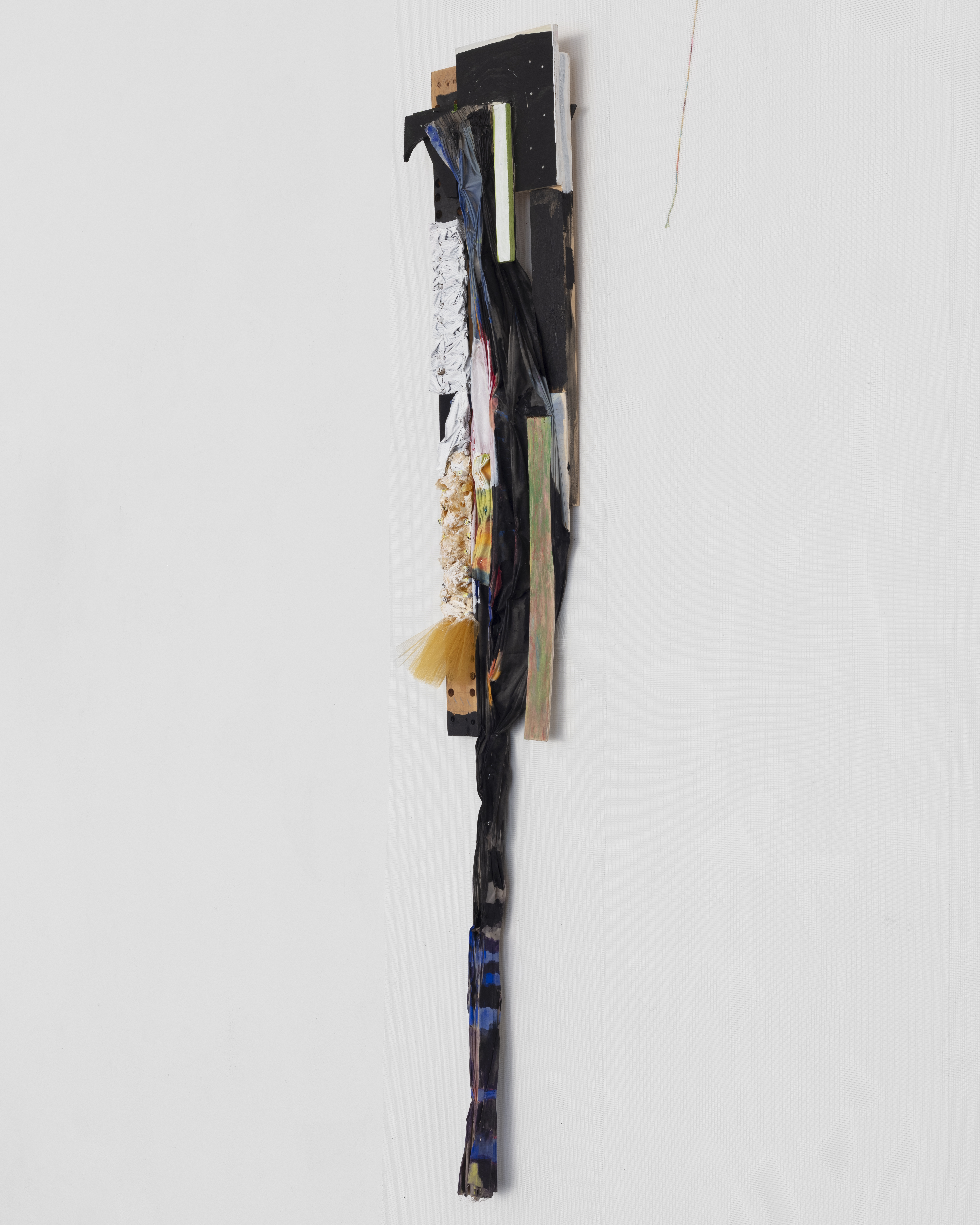 Eyes Closed Glow, 72.5” x 11.5” x 2”, wood acrylic, gouache, wax crayon, steel pins, fabric, nails, paper, 2024