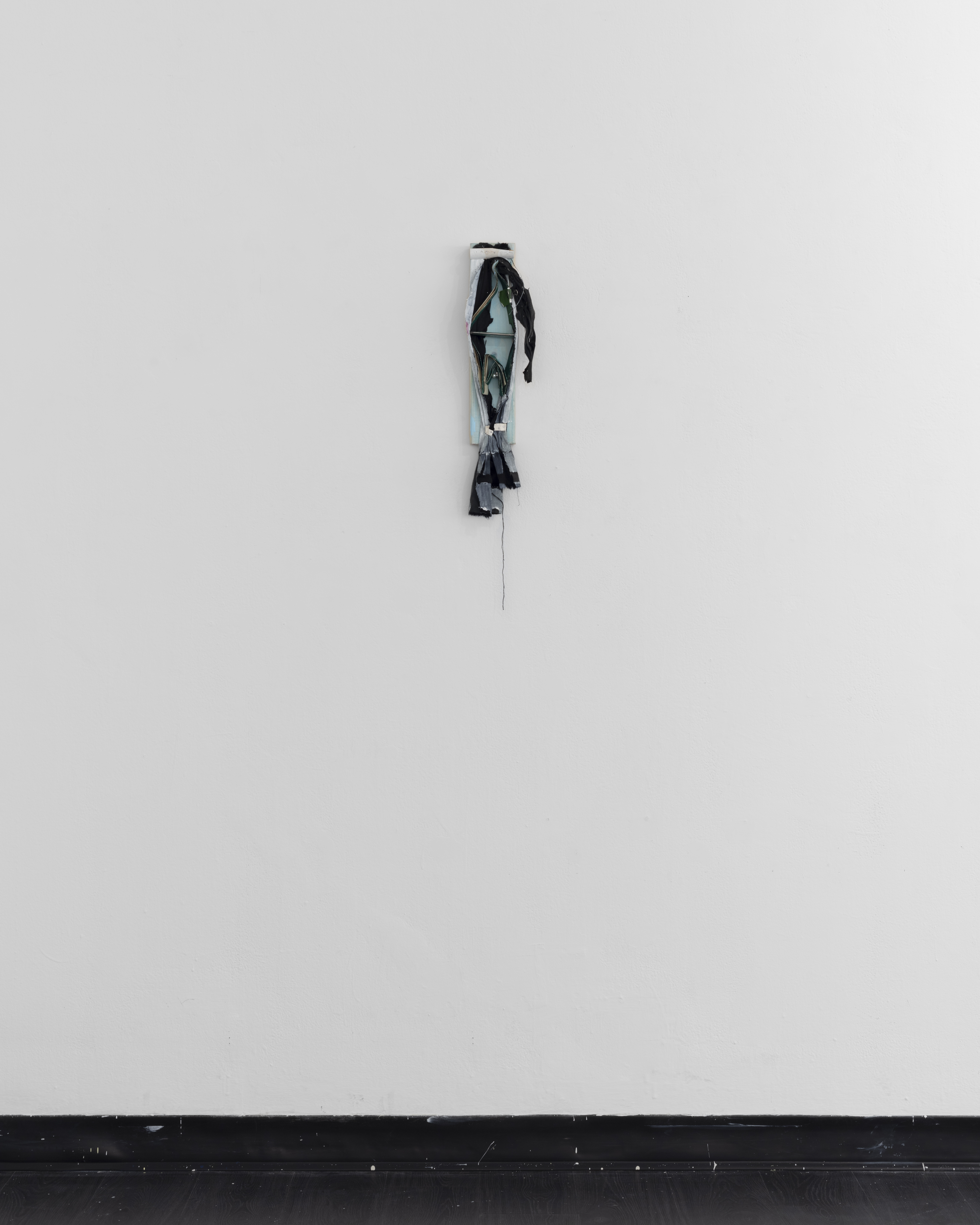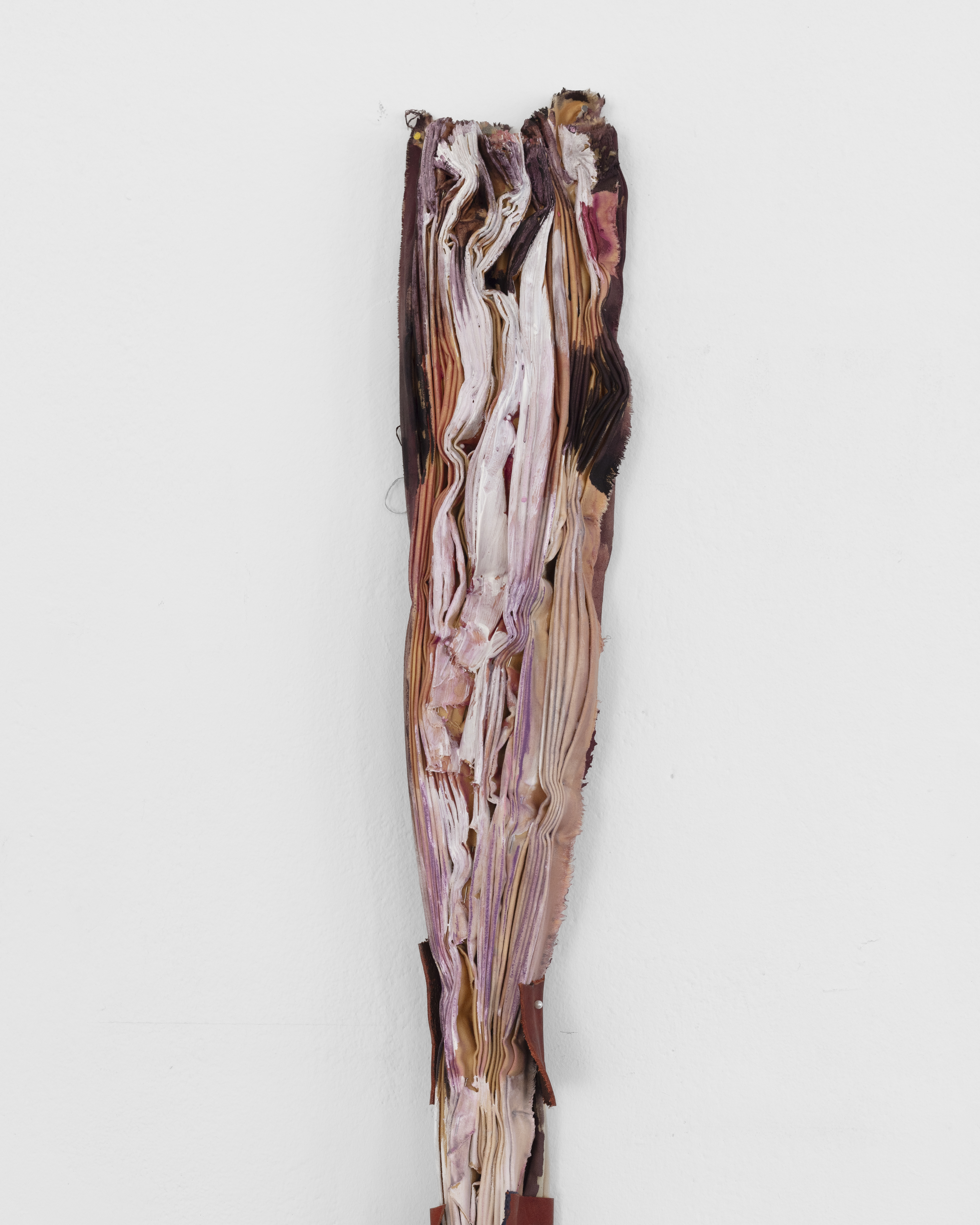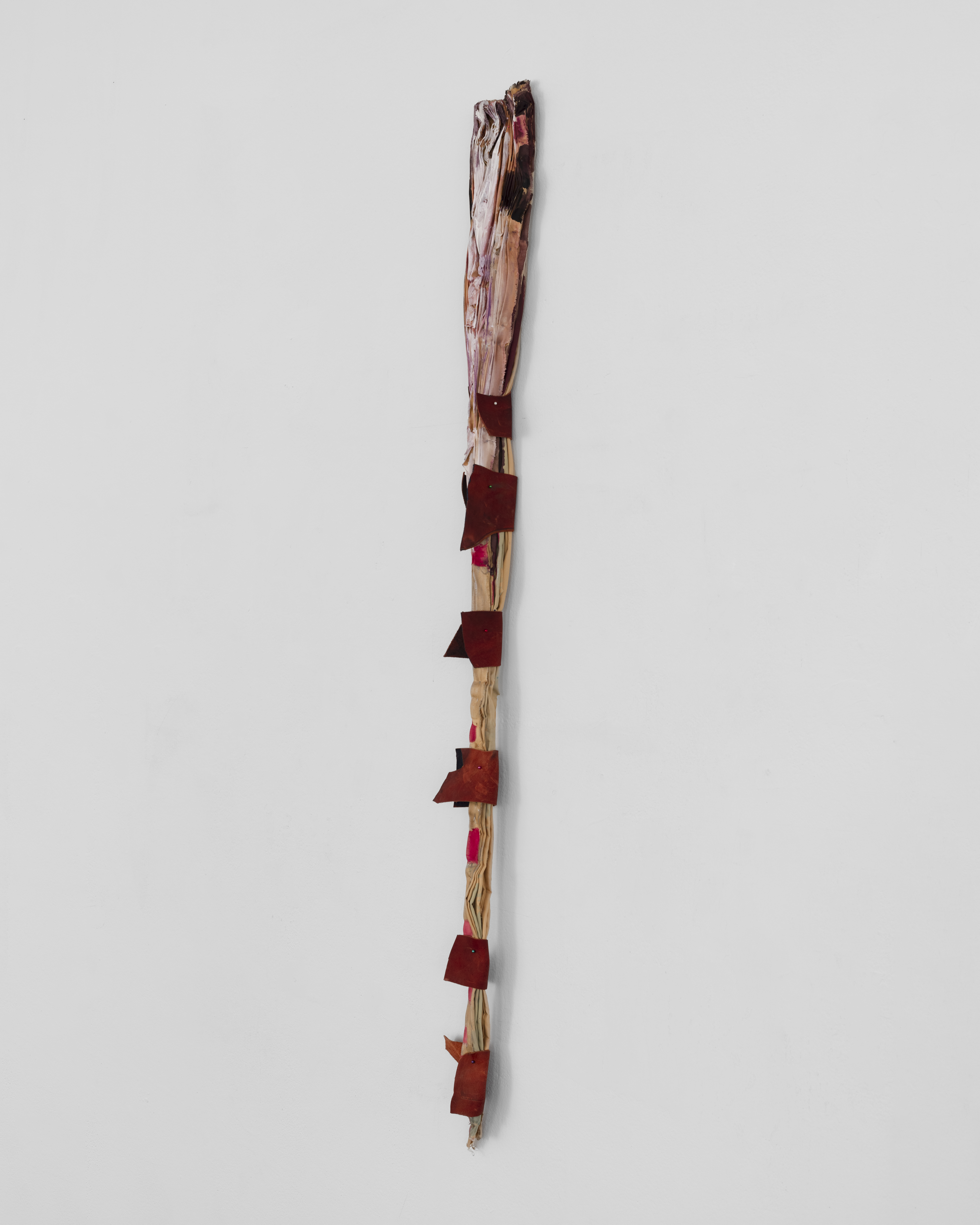 Sorceress Leaf Single Berry, 4 inches x 56 inches, fabric, steel dressmaking pins, leather, acrylic, pigment, 2025