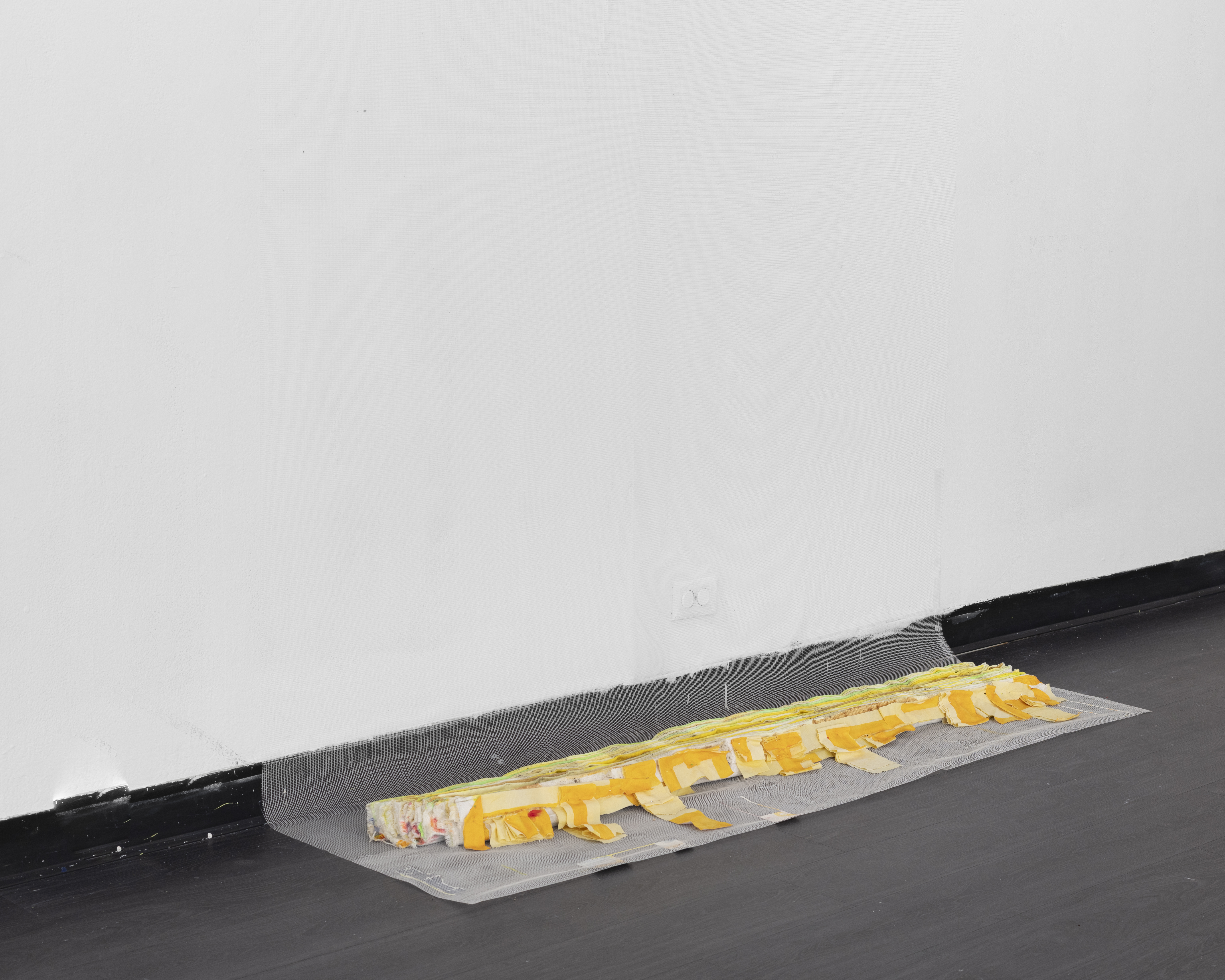 Without Love Nothing Would Burden Us To Our Knees, 63” x 13.5” x 3”, fabric, acrylic, gouache, steel dressmaking pins, ground river rocks, 2025