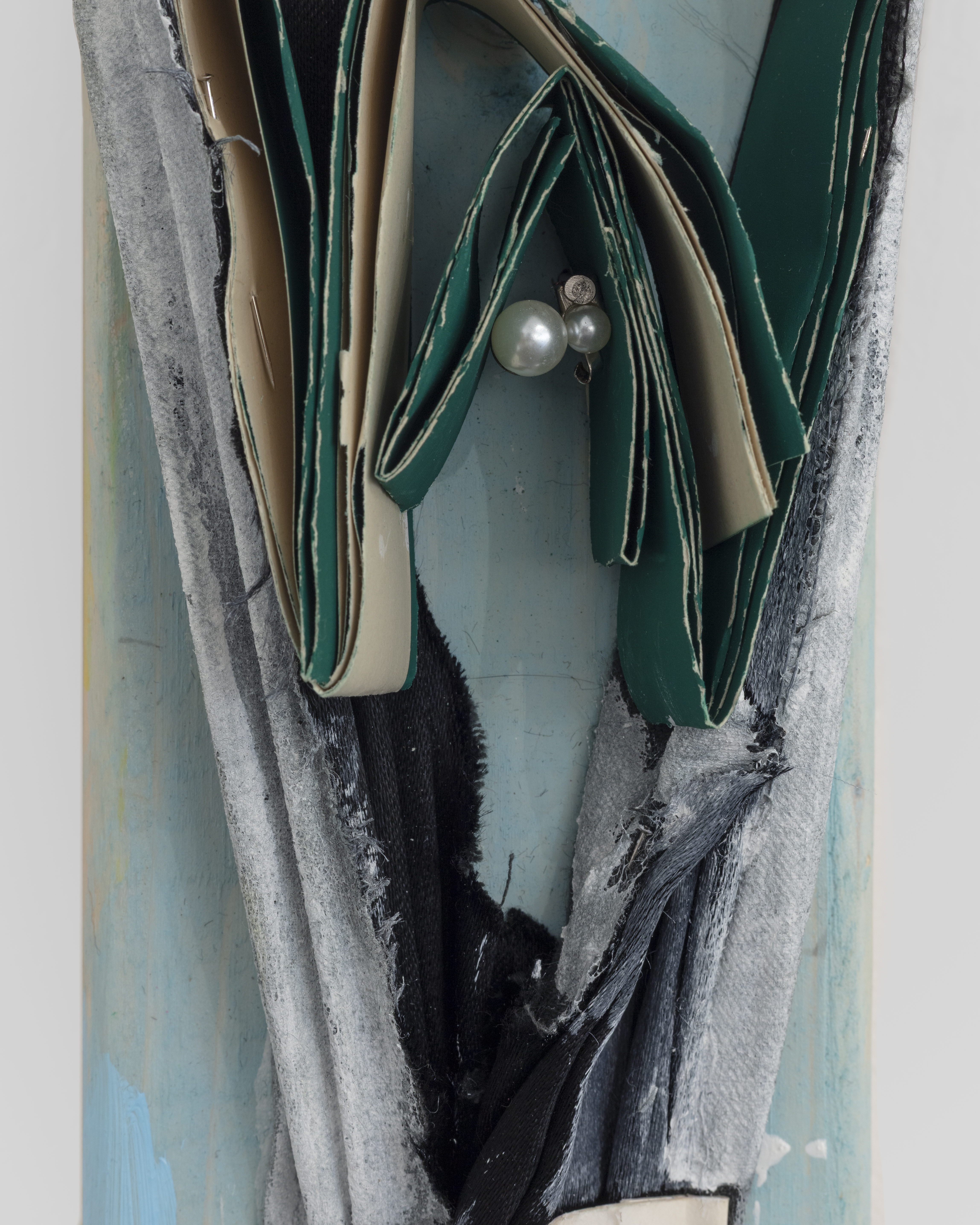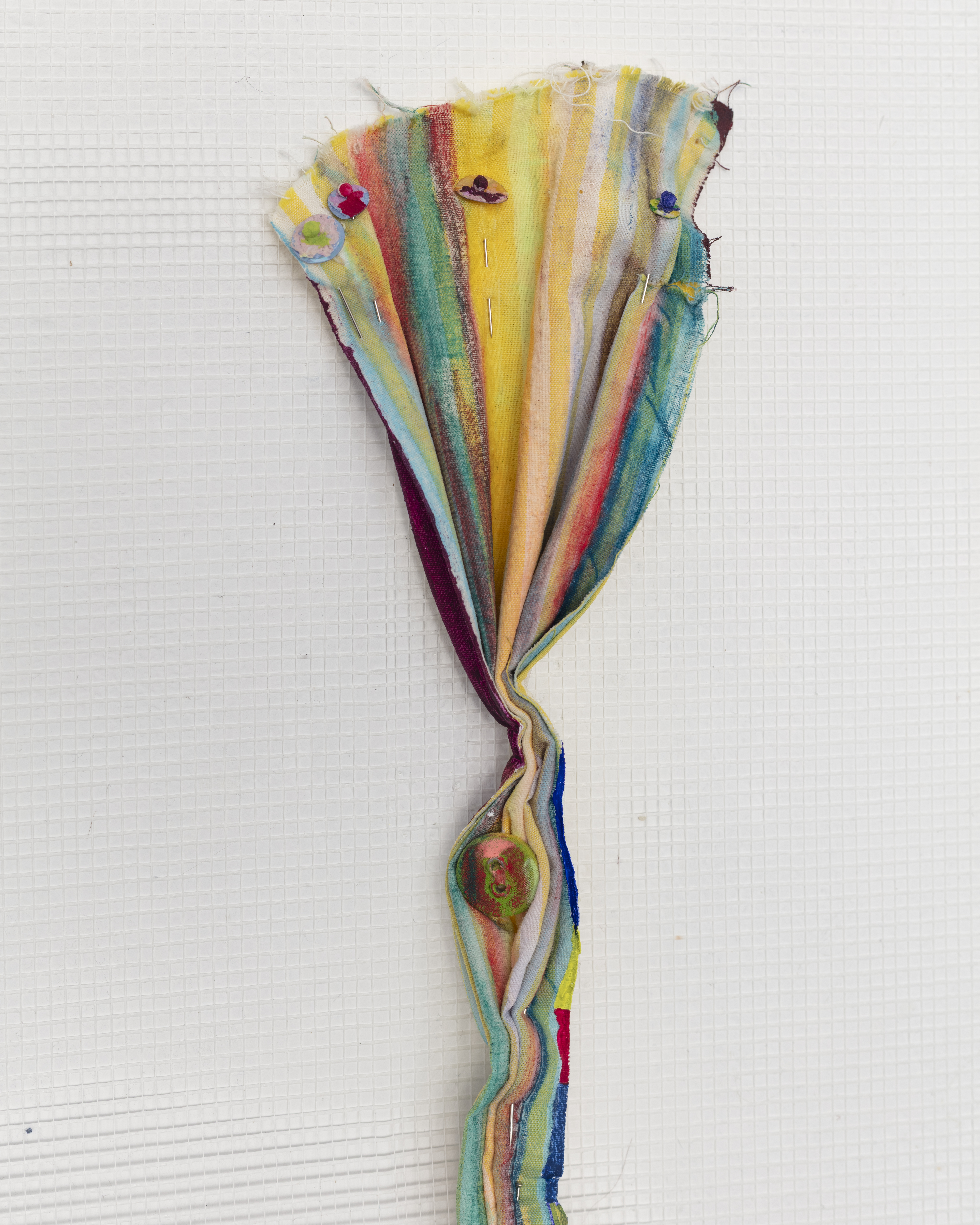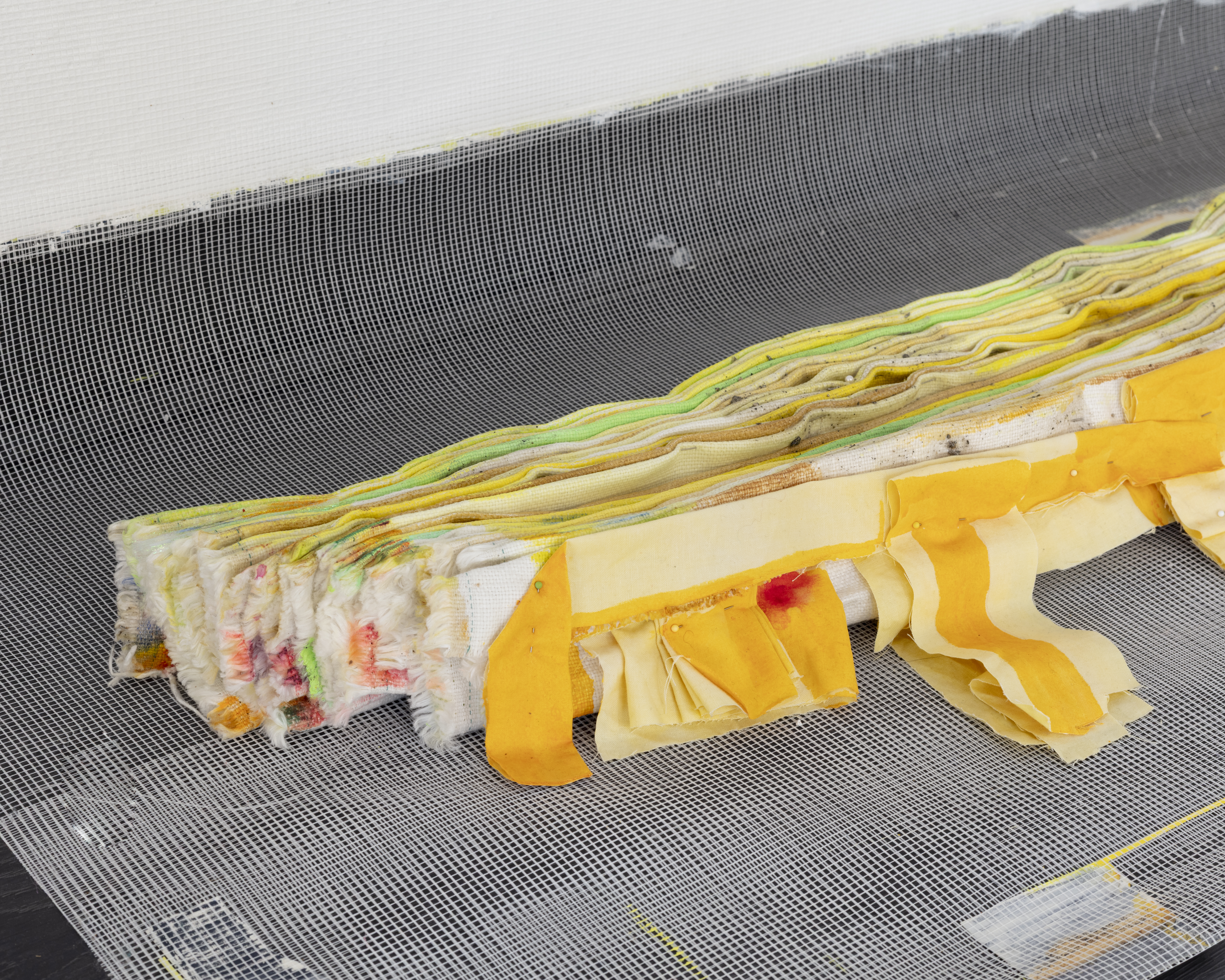 Alliance of Perverts, 4” x 24”, fabric, steel pins, sequins, acrylic, wax pastel, chalk pastel, 2025