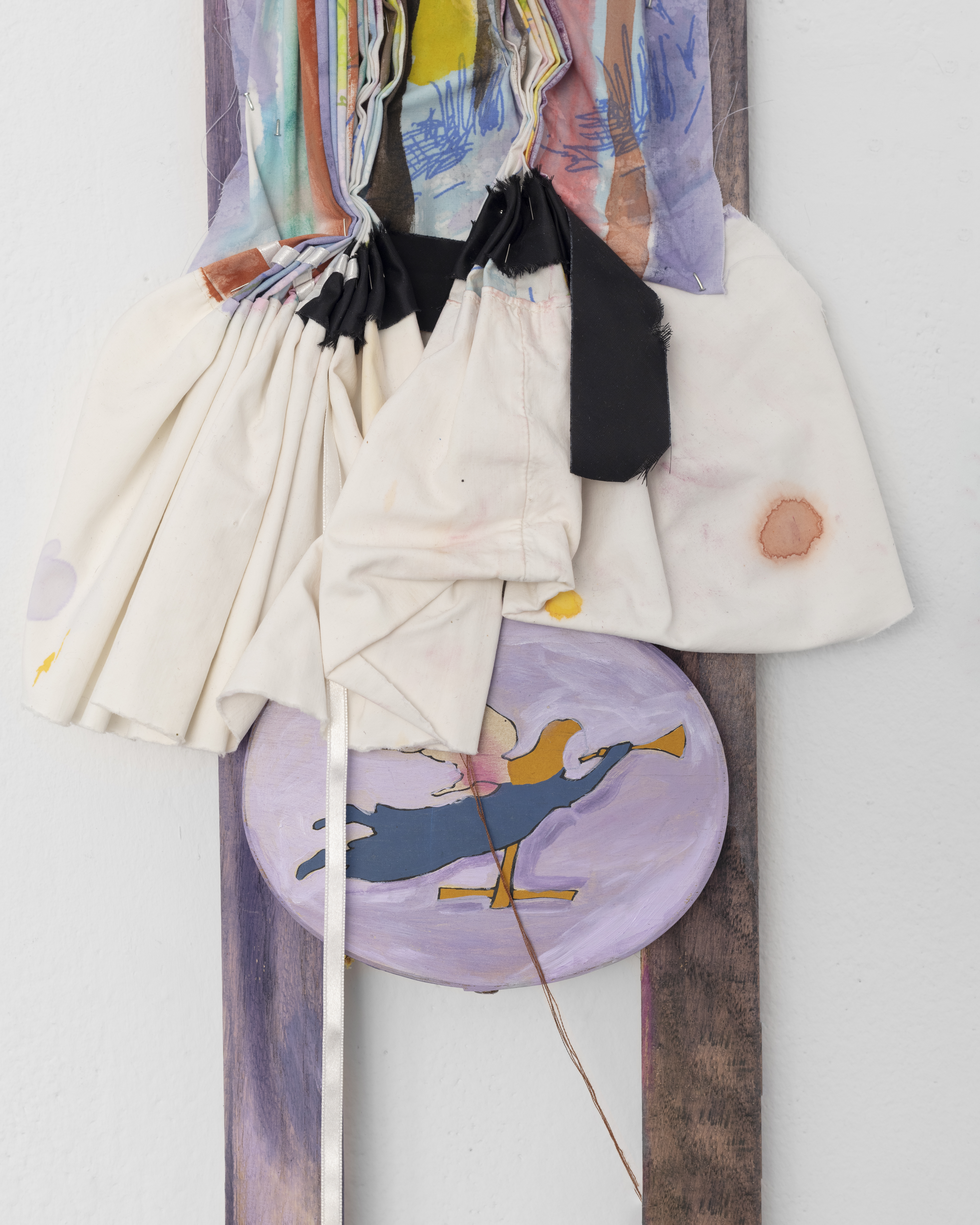 Riding For The Feeling, 49” x 13”, printed pillowcase, ribbons, steel pins, wood, nails, acrylic, gouache, 2025